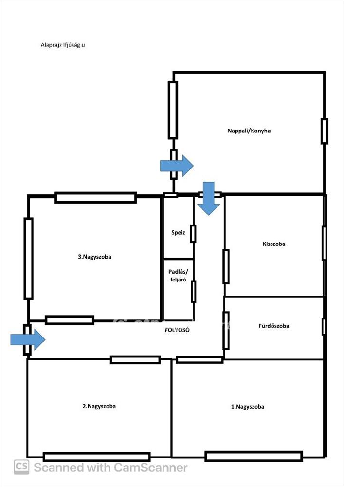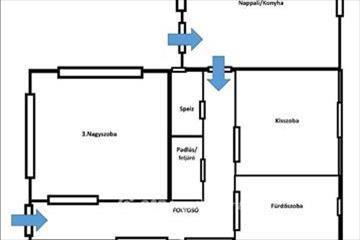 4 szoba, konyha + nappali, fürdőszoba, spejz, padlásfeljáró.