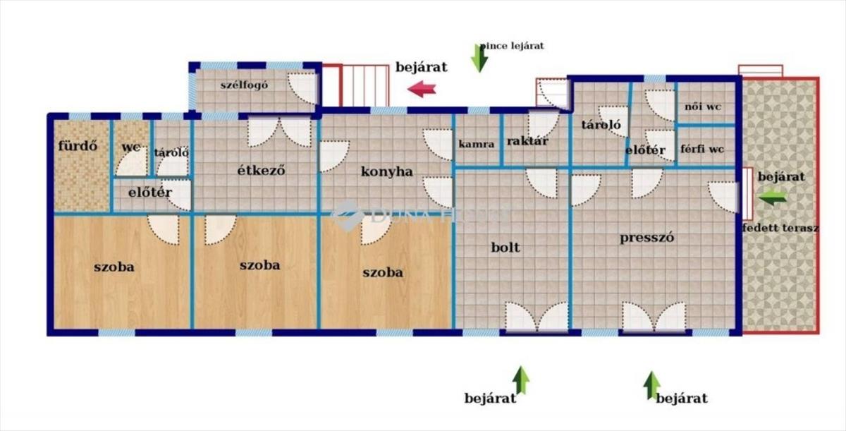 Az ingatlannak két része van, egy lakóház, ami 125 nm-es; a másik egy bolt-és presszó-rész összesen 100 nm-en, ami már nem üzemel, de a két épületrész átjárható.