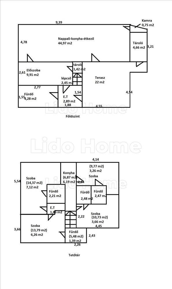 - a tetőtér helyiségei: 4 szoba, minden szobához tartozik fürdőszoba, konyha, közlekedő.