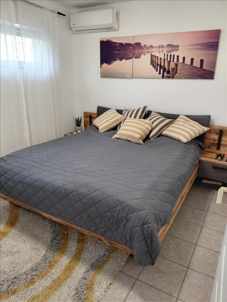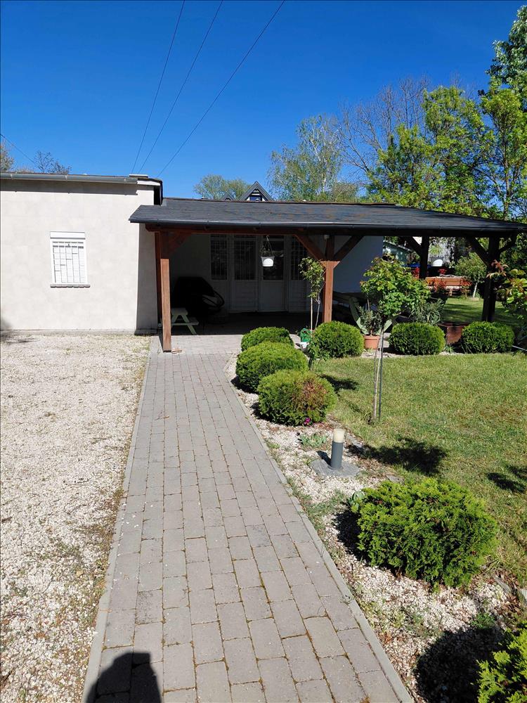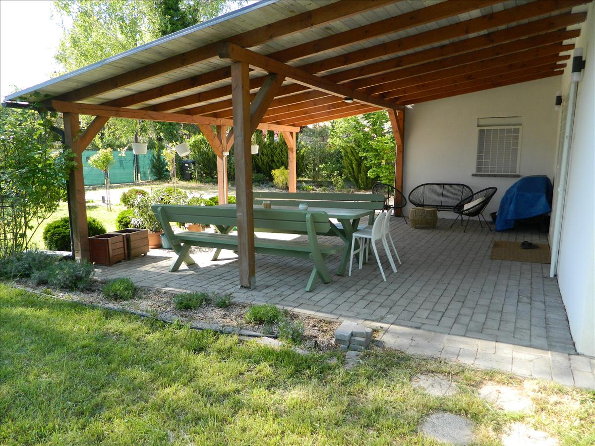 A nyaralóhoz tartozó telek 700 m2 mely a zöld fű mellett örökzöldekkel, bokrokkal, virágokkal vannak színesítve. Az épület 60 m2 alapterületű, mely 33 m2 amerikai konyhás nappalit + 2 hálót + fürdőszoba WC-t foglal magába. Az épület előtt egy 48 m2-es fedett, térkövezett terasz található.