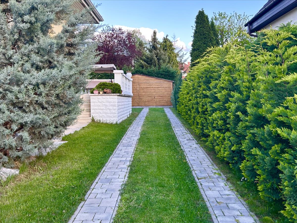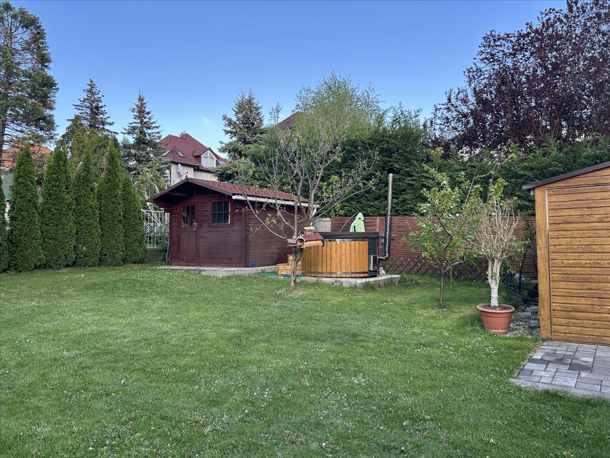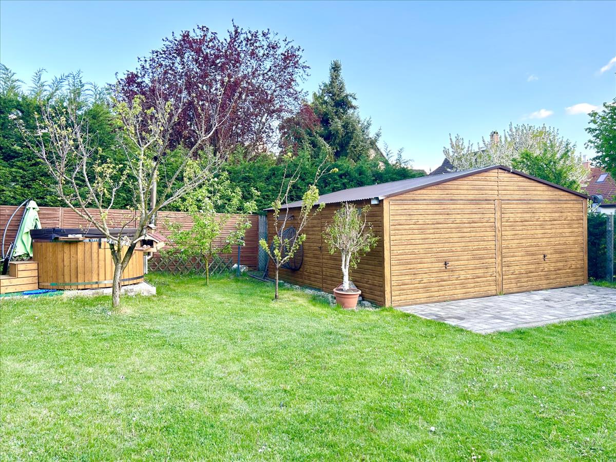 Két állásos garázzsal, a garázsban szerelő aknával, különálló kerti tárolóval, rendezett kerttel.