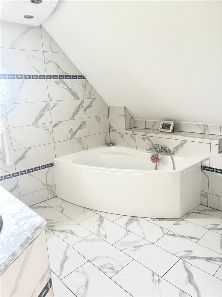 és egy nagy káddal, wc-vel rendelkező világos fürdőszoba.