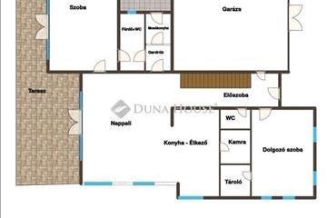A házhoz kapcsolódik még egy hatalmas fedett terasz, ahová még esős időben is kiülhetünk, gyönyörű, gyepesített kert, medence, fedett sütögető sarok, nagy kerti tároló ház, valamint egy kétbeállásos garázs is.