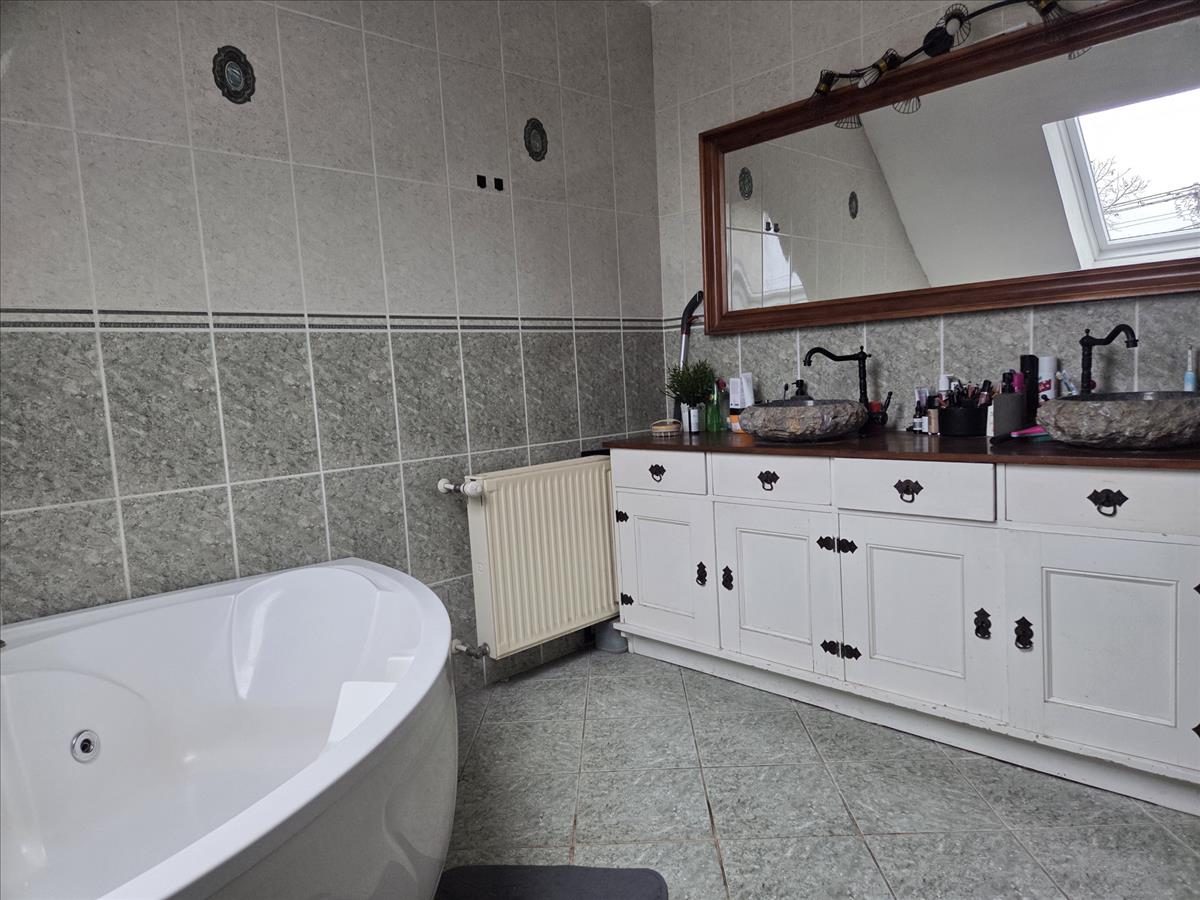 Emelet: 3 teljes értékű, kényelmes hálószoba (kettő közös erkéllyel) és egy tágas, dupla mosdós, kádas fürdőszoba.