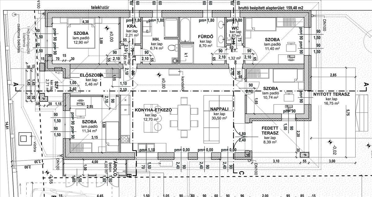 - Előszoba, nappali-konyha-étkező, 4 szoba, közlekedő, kádas fürdőszoba, zuhanyzós fürdő/háztartási helyiég, vendégmosdó + 4nm kültéri tároló, 8, 39nm fedett és 16, 75nm nyitott terasz.