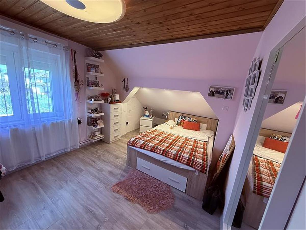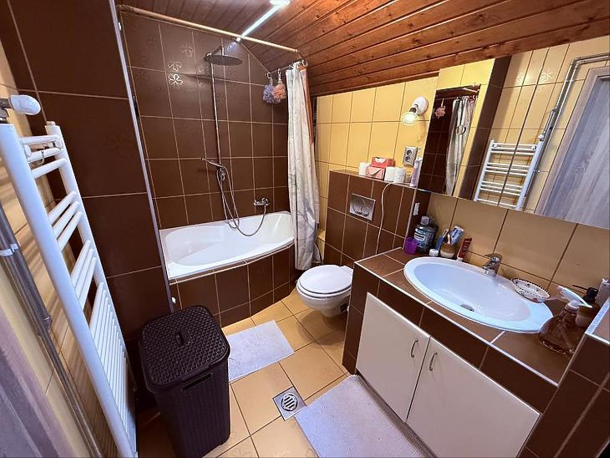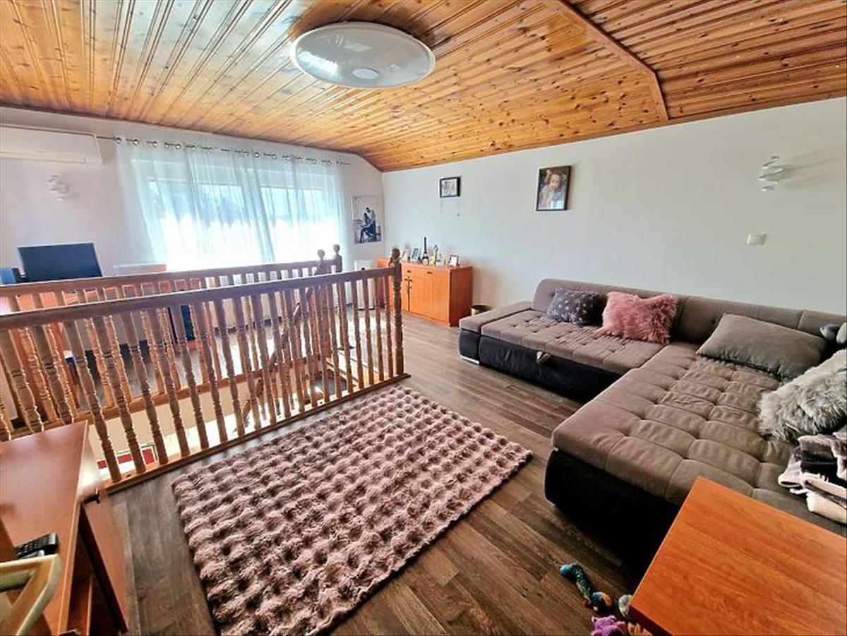 A felső lakás kb. 105 Nm, tágas nappalival, 2 hálószobával beépített szekrényekkel, külön gardróbbal, konyha-étkezővel és kádas-zuhanyzós fürdővel. Műanyag, dupla üvegezésű nyílászárók szúnyoghálóval, részben elektromos redőnyökkel, 2 klíma (ebből egy 3, 5 kW-os), a fűtést Ariston kondenzációs kazán biztosítja.