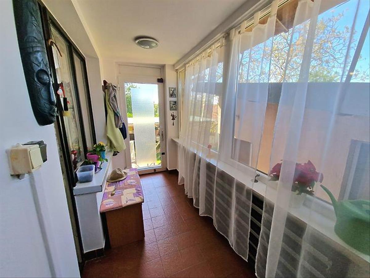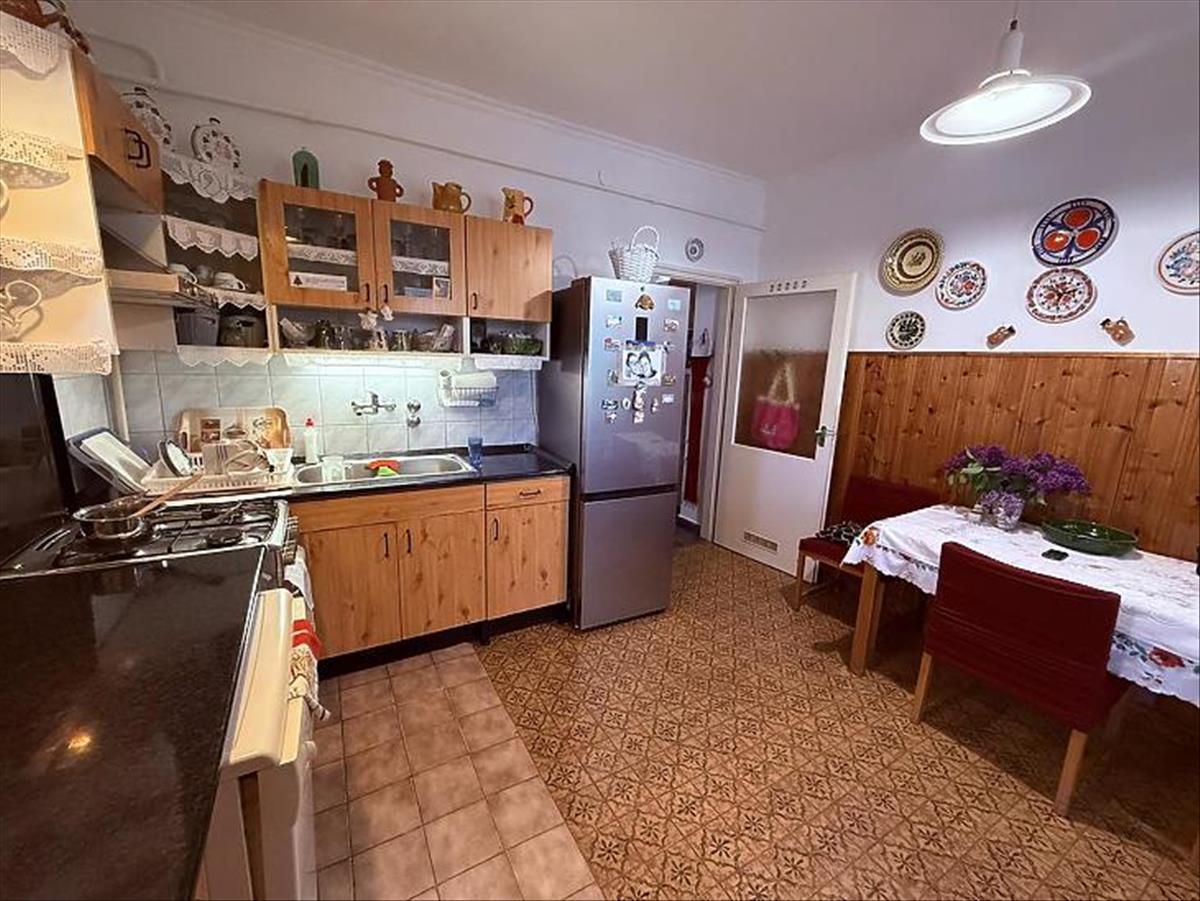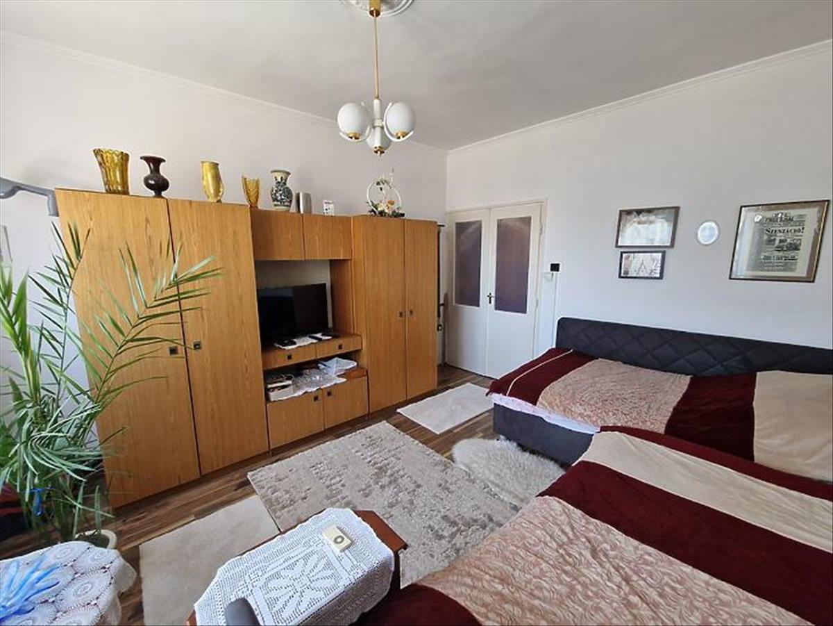 A felső lakás kb. 105 Nm, tágas nappalival, 2 hálószobával beépített szekrényekkel, külön gardróbbal, konyha-étkezővel és kádas-zuhanyzós fürdővel. Műanyag, dupla üvegezésű nyílászárók szúnyoghálóval, részben elektromos redőnyökkel, 2 klíma (ebből egy 3, 5 kW-os), a fűtést Ariston kondenzációs kazán biztosítja.