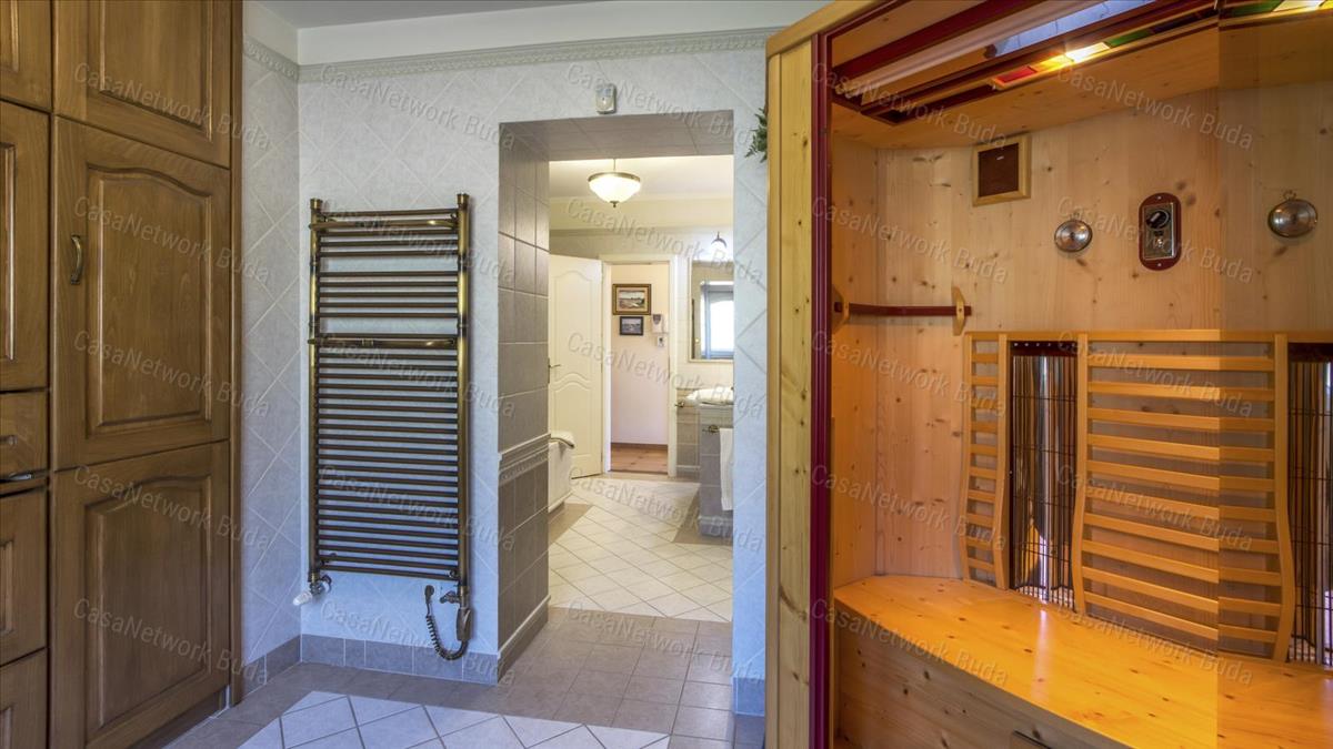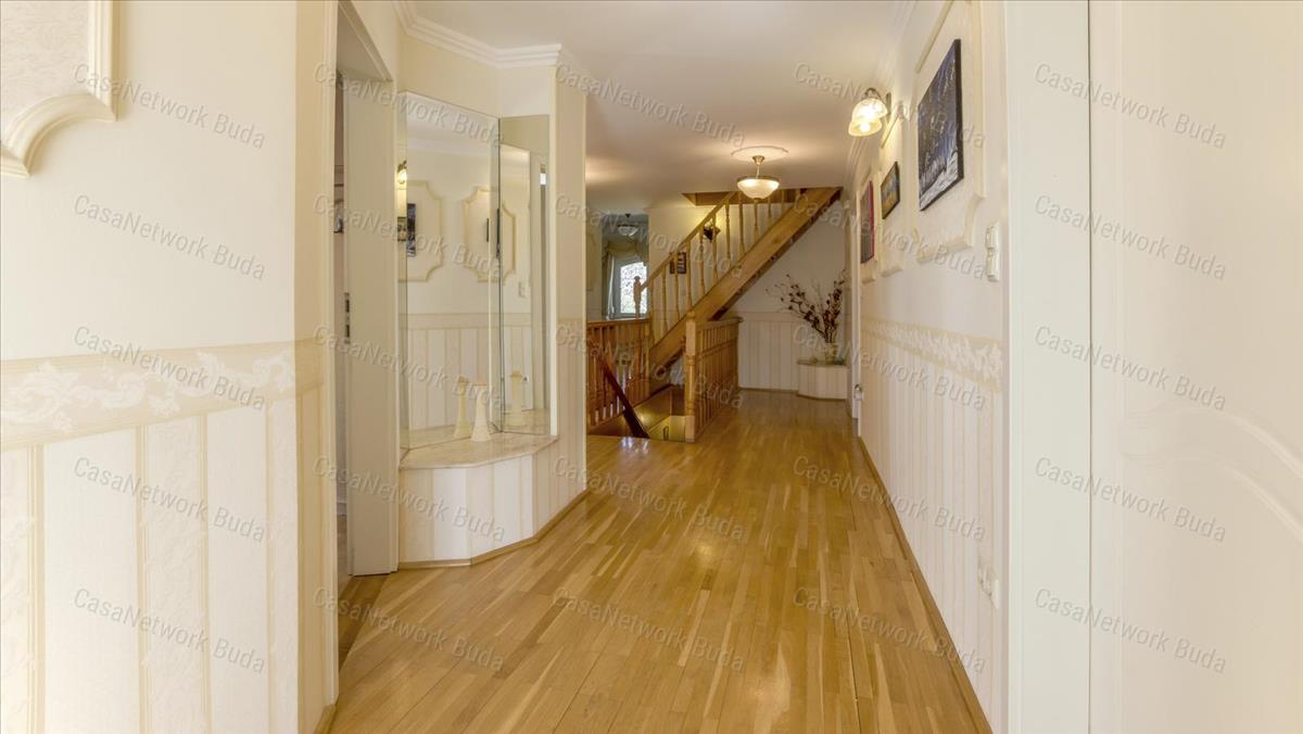 Tágas előtér, világos nappali-étkező-konyha egy hatalmas légtérben, társalgó/zongoraszoba, kamra, dolgozószoba, szaunával felszerelt fürdőszoba (káddal és zuhanyzóval), valamint 49 m²-es kertkapcsolatos, részben fedett terasz.
