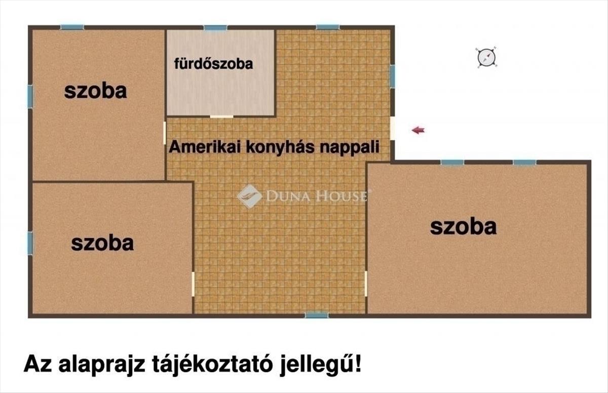 Az ingatlan elrendezése: amerikai konyhás nappali + 3 külön nyíló hálószoba.