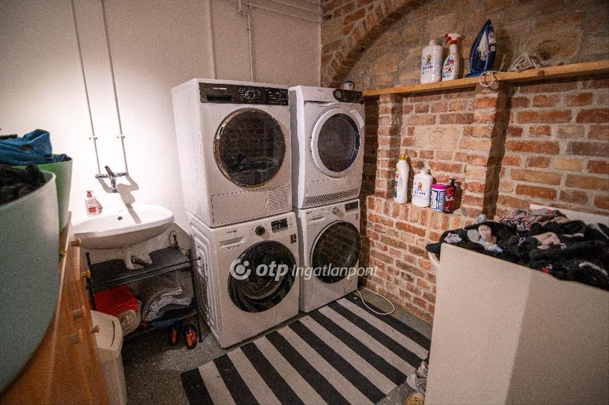 A ház alsó szintjén egy hatalmas 3 állásos garázs található, mellette egy óriási tároló, ami enyeli a család összes holmiját minden évszakra lebontva vagy akár a jövő generációjának kialakítható próbaterem is lehet ha zenéről van vagy bármely hobbiról van szó, tovább haladva pedig egy komlpett lakrésznek kialakítható vagy akár társasági események alkalmával használható részleg, gardróbbal, mosokonyhával, mosdóval.
