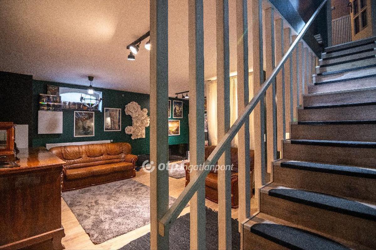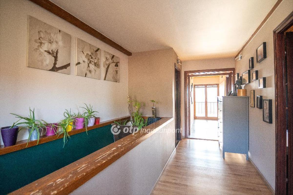 A középső szinten a gyönyörűszép nappali - melynek ékessége kétség kívül a különleges kandalló - mellette a napfényes étkező, konyha, kamra, tovább haladva a közlekedőn pedig egy dolgozó szoba, fürdő illetve mosdó található, a teljesen leválasztott előtérbe pedig a közel 40 m-es teraszról léphetünk be.