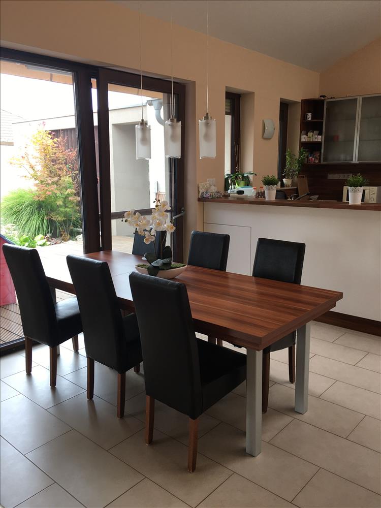 A családi ház konyhája tágas, egy vasárnapi ebéd elkészítése, többgenerációs vendégségbe érkezett családnak sem jelentene gondot, és az étkezőben le is ültethetőek sokan is. Aki itt főzne, nincs elzárva a családtól, mert a nappalival, az étkező, és a konyha csak minimiálisan, érzületesen szeparált.