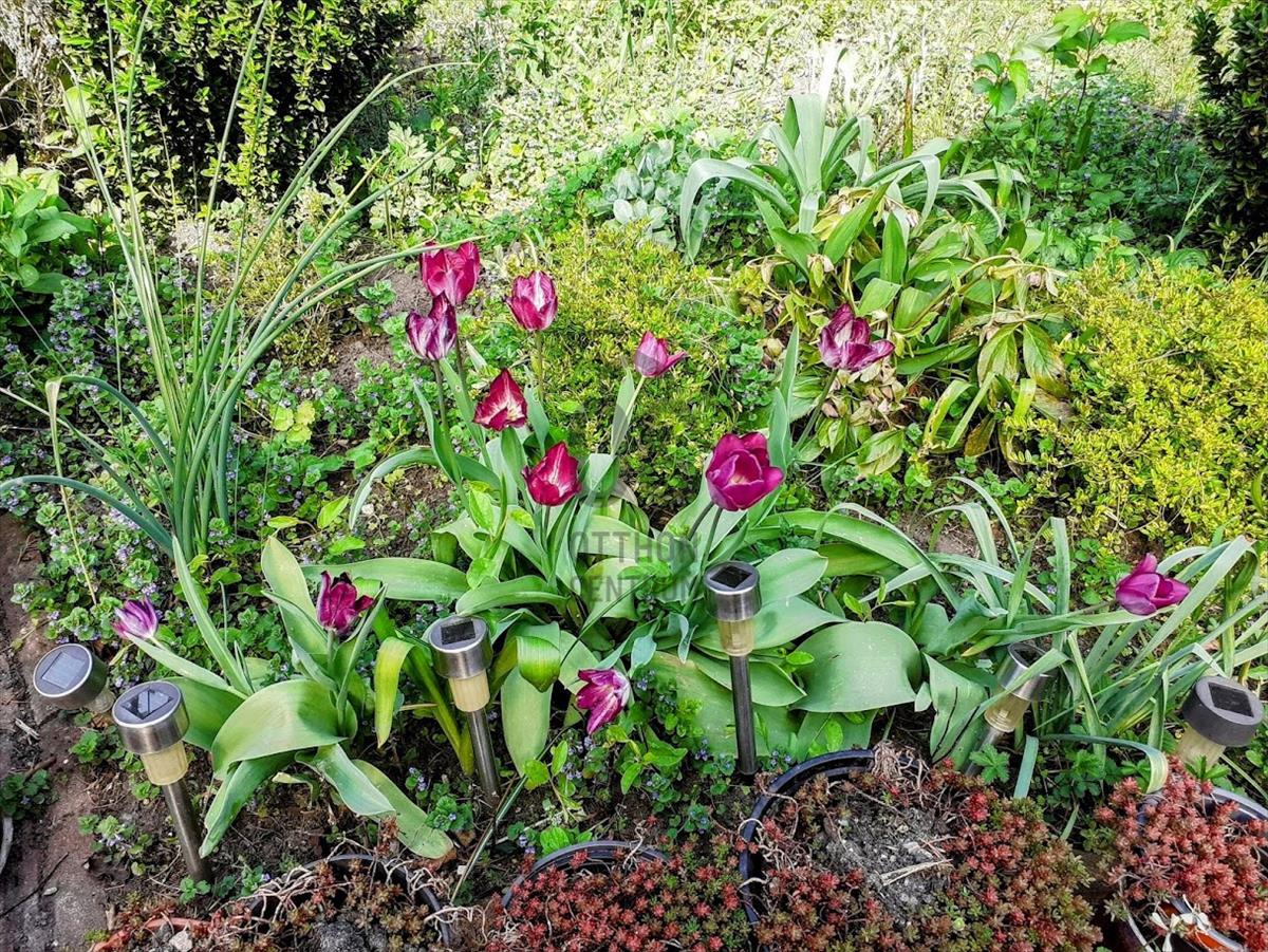 A sok gondoskodással művelt kert fúrt kútról van öntözve. Rengeteg dísznövény és gyümölcsfa található. Magas ágyásokban konyhakerti növények zöldellnek.