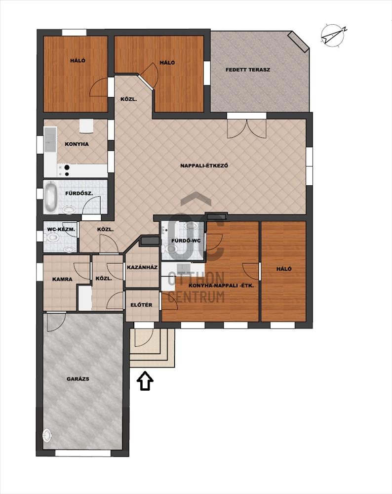 A nagyobb lakórész nem csak a főbejáraton, hanem a garázsból is közvetlen bejárható. Kamrából a közlekedőbe és már a nappali étkezőben is vagyunk. Itt elszeparálva de egy légtérben van együtt a konyhával. Tágas ajtók nyílnak a fedett erkélyre és két különálló hálószobára. Egy fürdőszoba, egy külön wc, egy kazánház, modern infra szauna nyílik a közlekedőből.