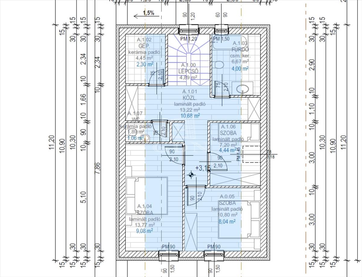 A földszint hasznos területe 54, 76 m2, tetőtér hasznos területe 44, 55 m2. Garázs 21, 00 m2, terasz 13, 20 m2. Ár: 115 MFt FIX 3% lakáshitelre megvehető