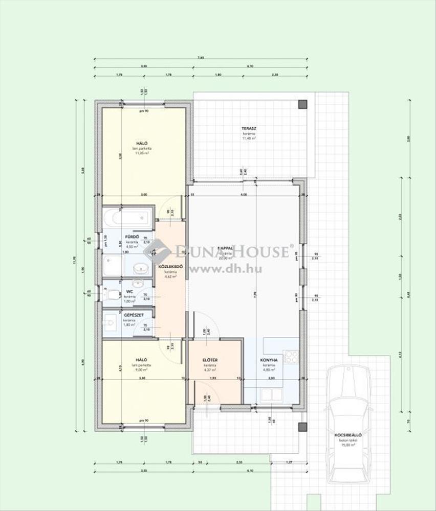 A hirdetésben szereplő ingatlan a Vesta 1 típusház, alapterülete: 63, 94 nm + terasz 11, 48 nm.