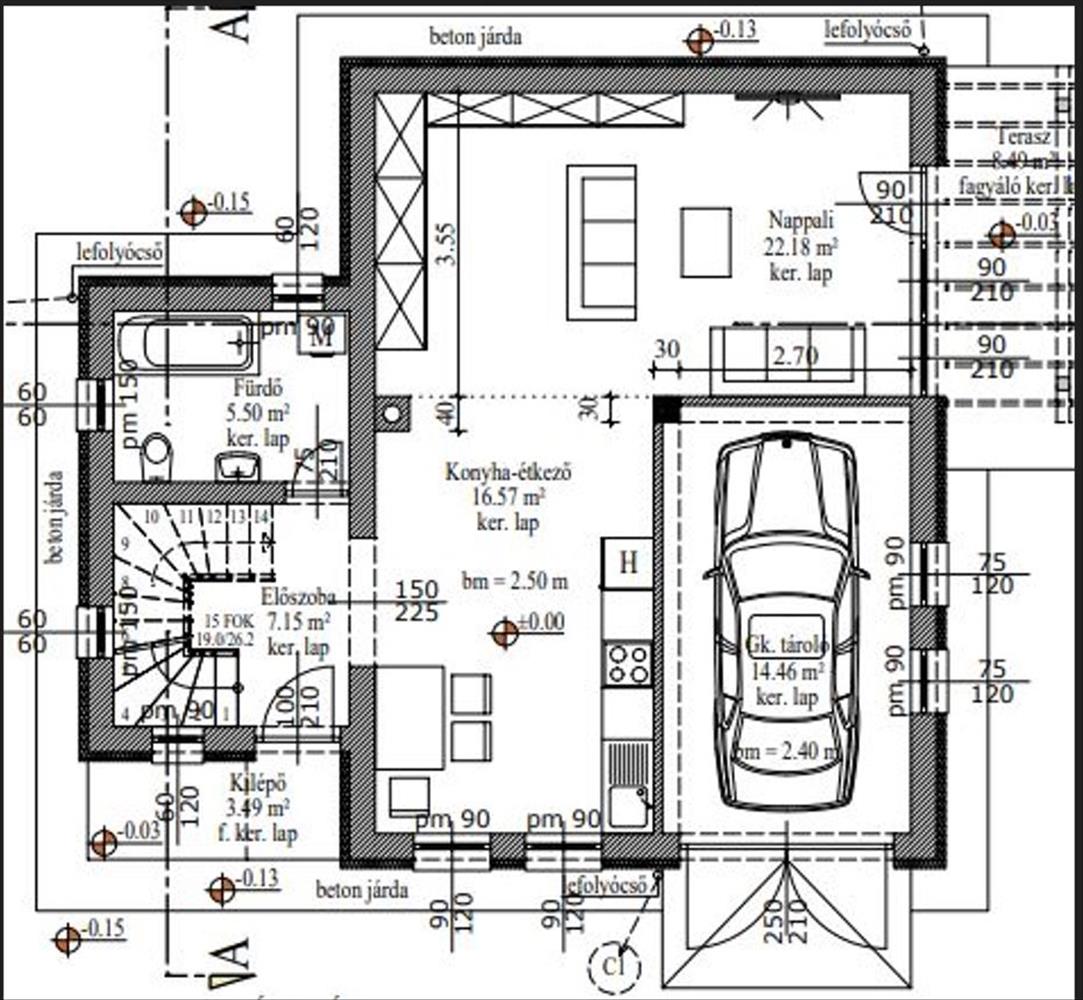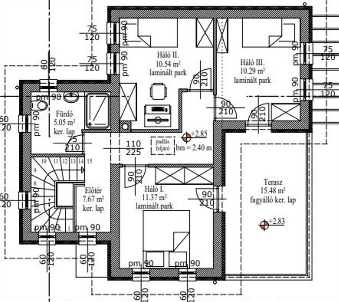 A kétszintes családi házban a földszinten nappali, étkező konyhával, fürdőszoba, előszoba kap helyet, az emeleten három szoba, (10, 5 nm , 10, 3 nm , 11, 4 nm ) fürdőszoba, és egy 15 nm -es terasz.