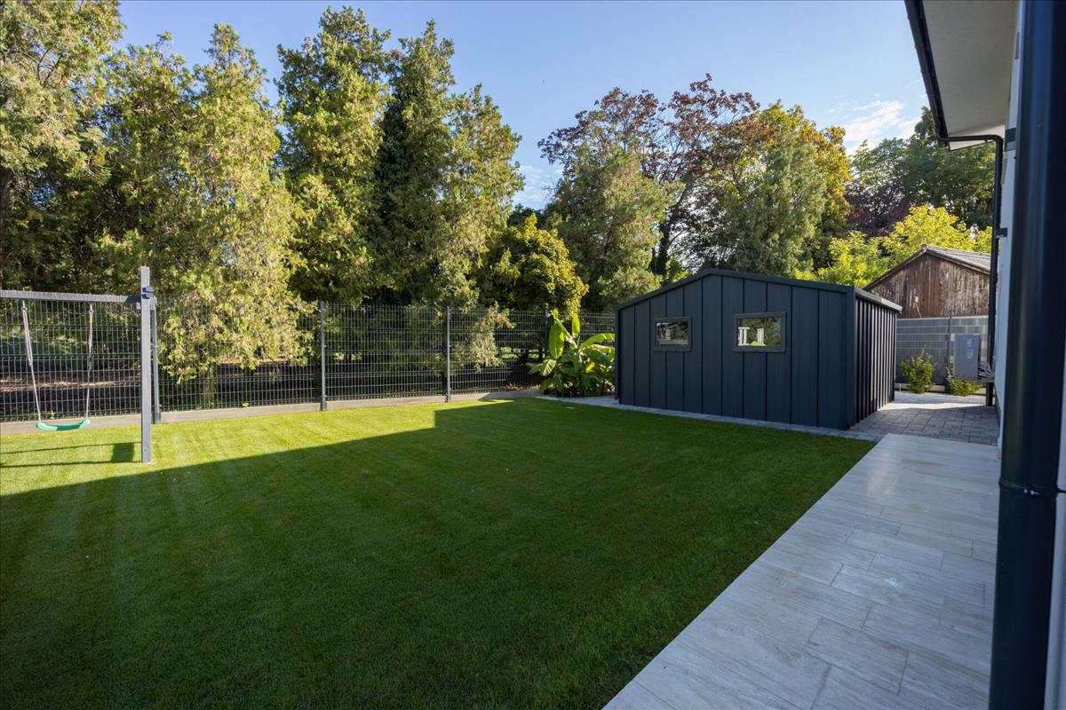 A telek esztétikailag és műszakilag is kifogástalan: térkövezett burkolatok, friss gyepszőnyeg, ültetett növényzet, vakondháló, automata locsoló- és csepegtetőrendszer működik, melyet fúrt kút lát el vízzel. a speciális, rozsdamentes, színterezett elektromos kapun át kényelmesen beállhatunk a négy autó számára kialakított parkolófelületre. a használati lehetőségeket tovább bővíti a praktikus kerti tároló.