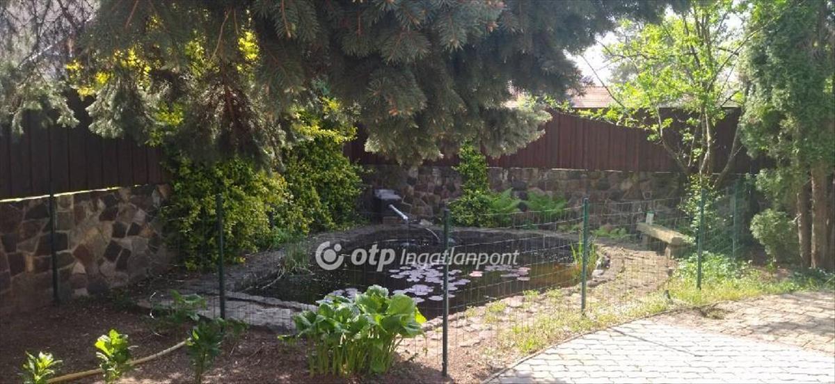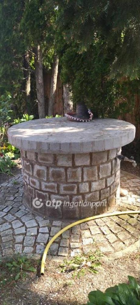 Gondozott kert dísztóval, épített kerti utak terméskő burkolattal, fedett kút szivattyúval