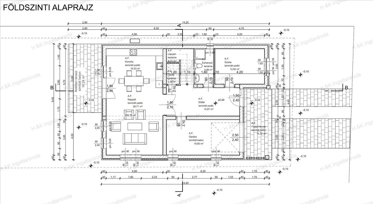 A földszint 117, 09 nm: a házba belépve az előtérbe érkezünk, ahonnan feltárul a nagy nappali- étkező-konyha, szemben az emeletre vezető lépcső (alatt tároló), balra fordulva pedig egy wc + zuhanyzó és egy nagyméretű szoba valamint a lakáskapcsolatos garázs.
