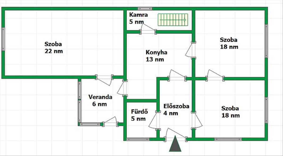 Elrendezése: 3 szoba, konyha, fürdőszoba, előszoba, veranda, valamint egy kamra.