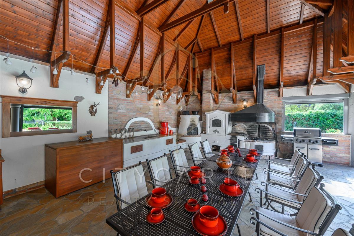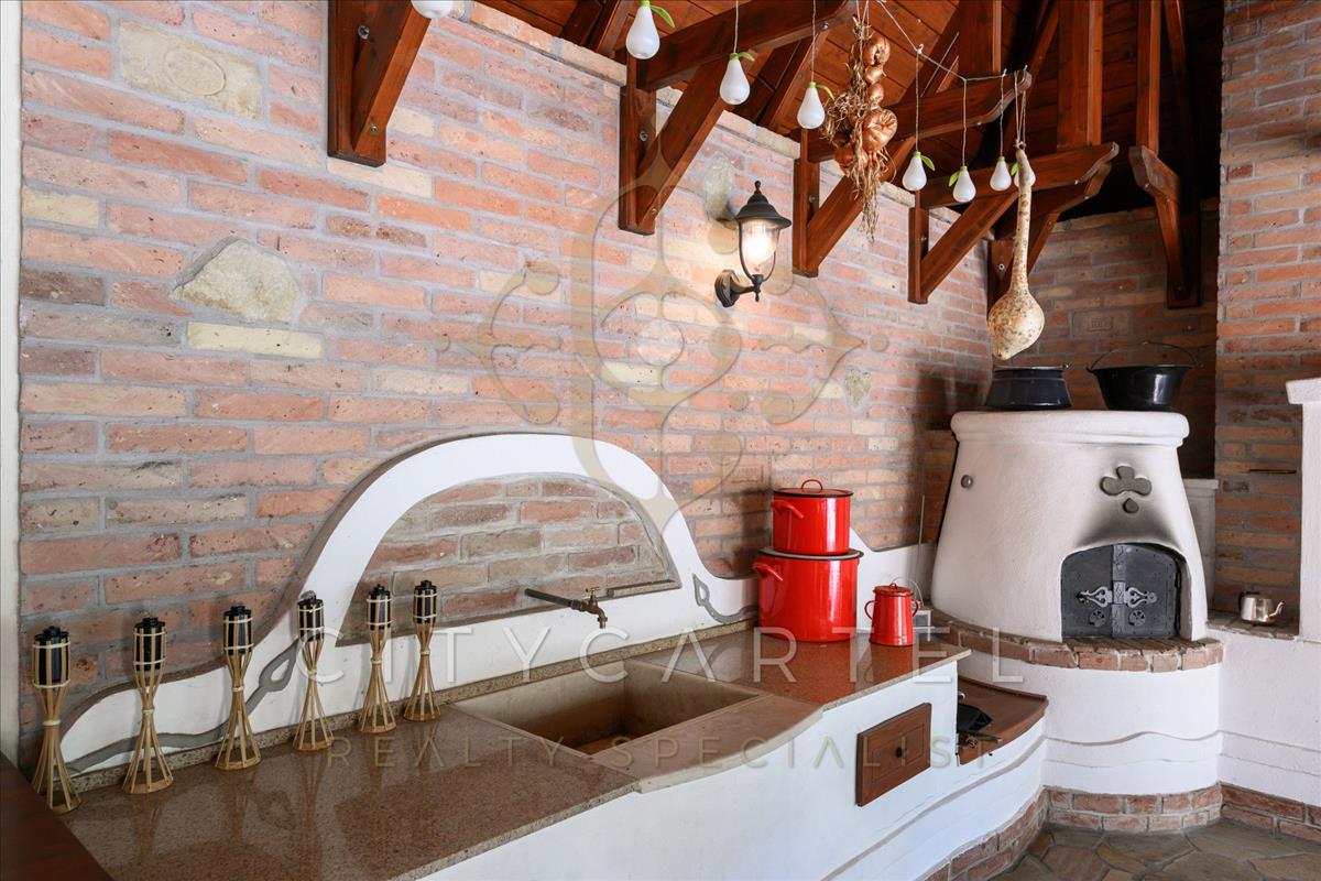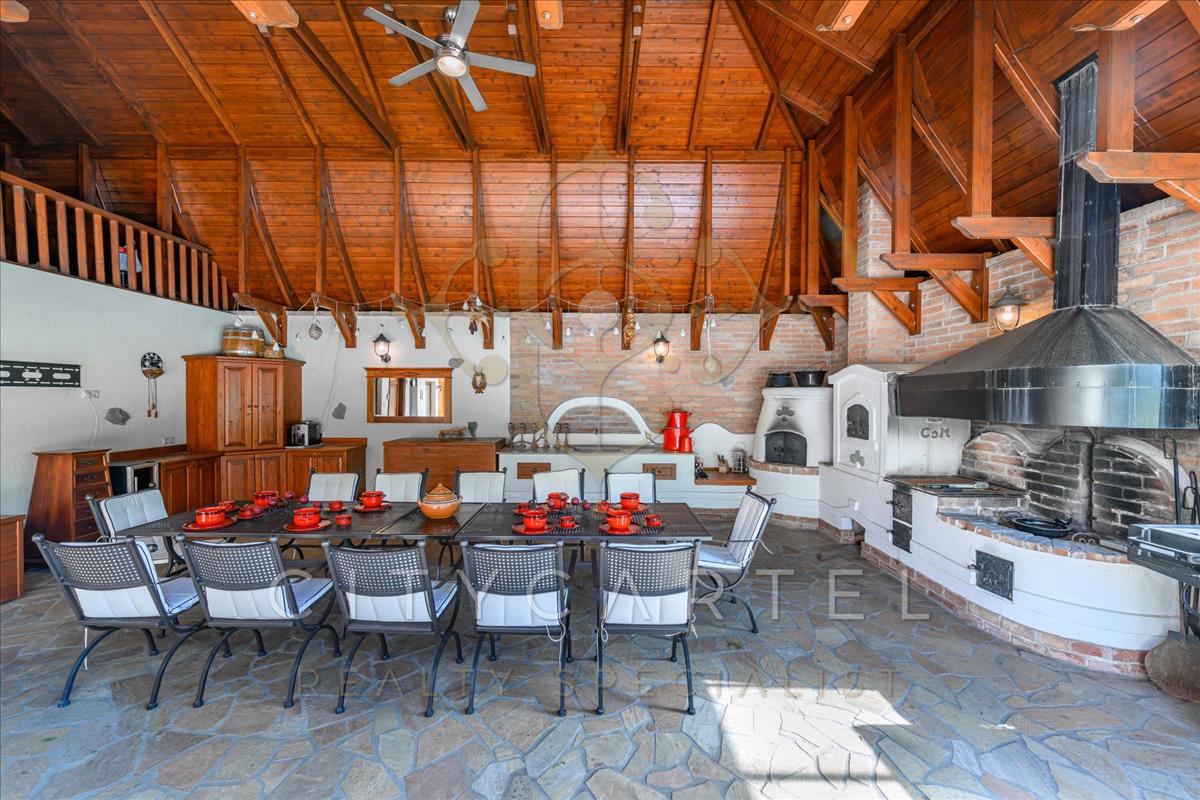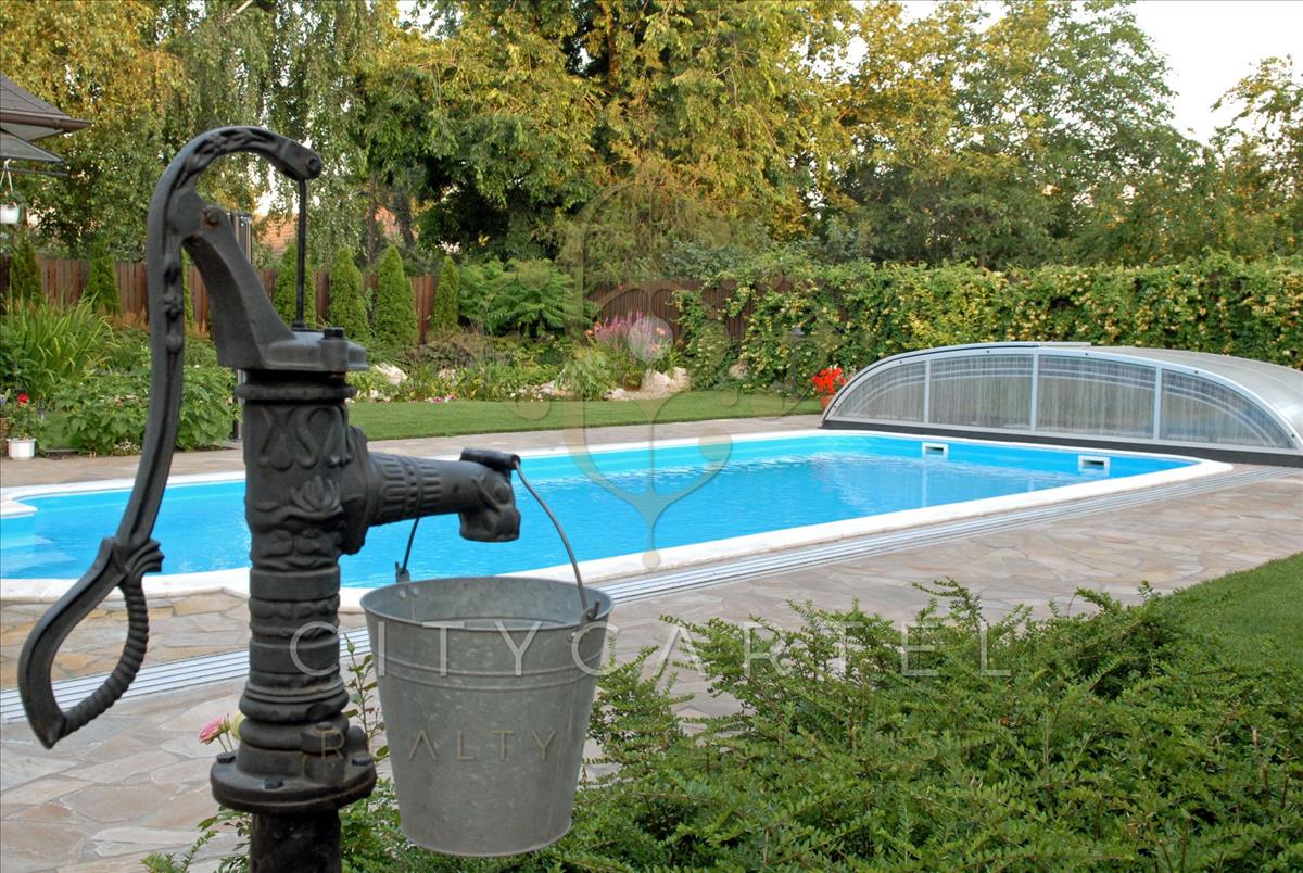 A teraszról a hátsó kerten át a közel tíz méteres, ellenáramoltatóval felszerelt medencéhez jutunk, amit polikarbonát tető borít. a medence köré egy teljes kinti birodalom épült hatalmas társasági életnek adva lehetőséget, vagy teljes nyugalomnak. Felszerelt konyhát, fürdőszobát, kemencét és kerti sütögetőt, grillt találunk a nagy belmagasságú, fedett kerti étkezőben, ahol 18 főre tudunk kényelmesen teríteni.