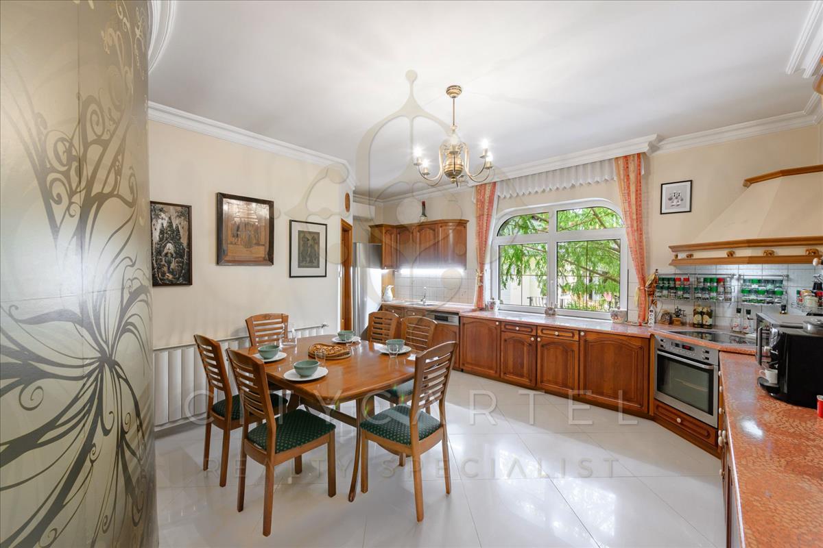 Az elegáns, nagypolgári stílusnak megfelelően az étkezőben legalább 12 főre teríthetünk, és a konyha külön, elválasztva került elhelyezésre, azonban átadó ablakon keresztül biztosított az egyszerű tálalás.