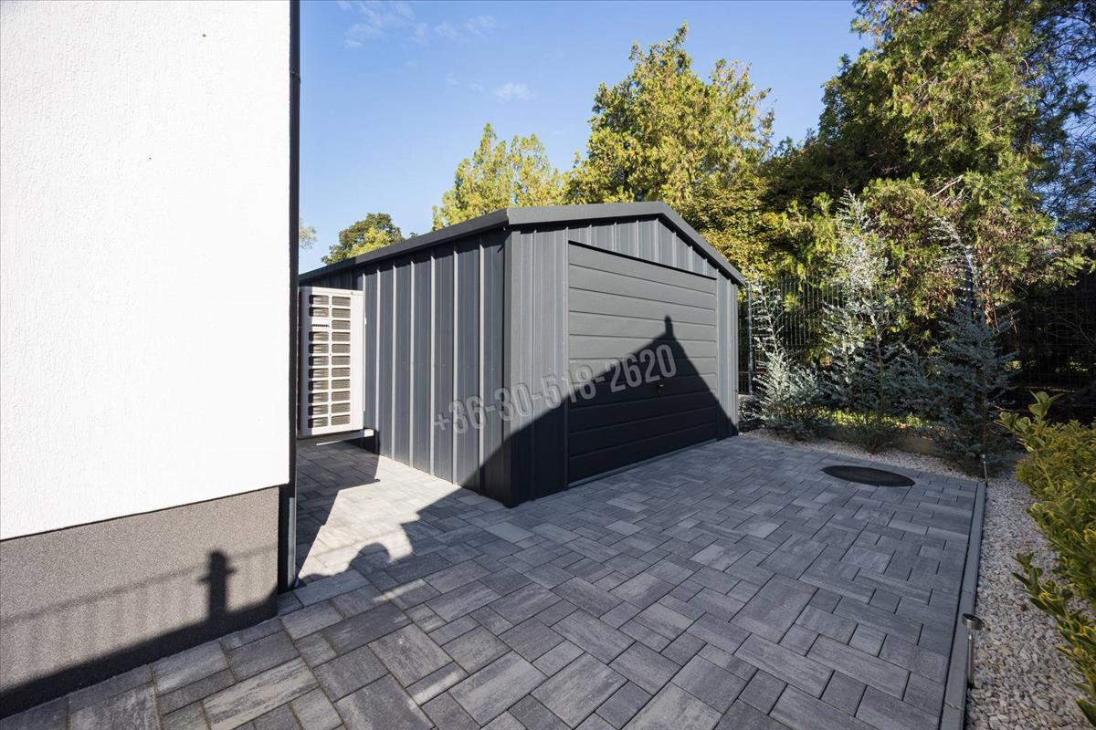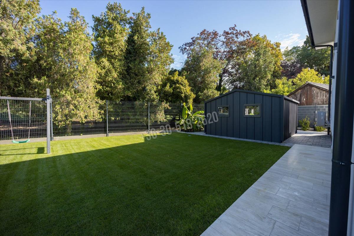 A telek esztétikailag és műszakilag is kifogástalan: térkövezett burkolatok, friss gyepszőnyeg, ültetett növényzet, vakondháló, automata locsoló- és csepegtetőrendszer működik, melyet fúrt kút lát el vízzel. a speciális, rozsdamentes, színterezett elektromos kapun át kényelmesen beállhatunk a négy autó számára kialakított parkolófelületre. a használati lehetőségeket tovább bővíti a praktikus kerti tároló.