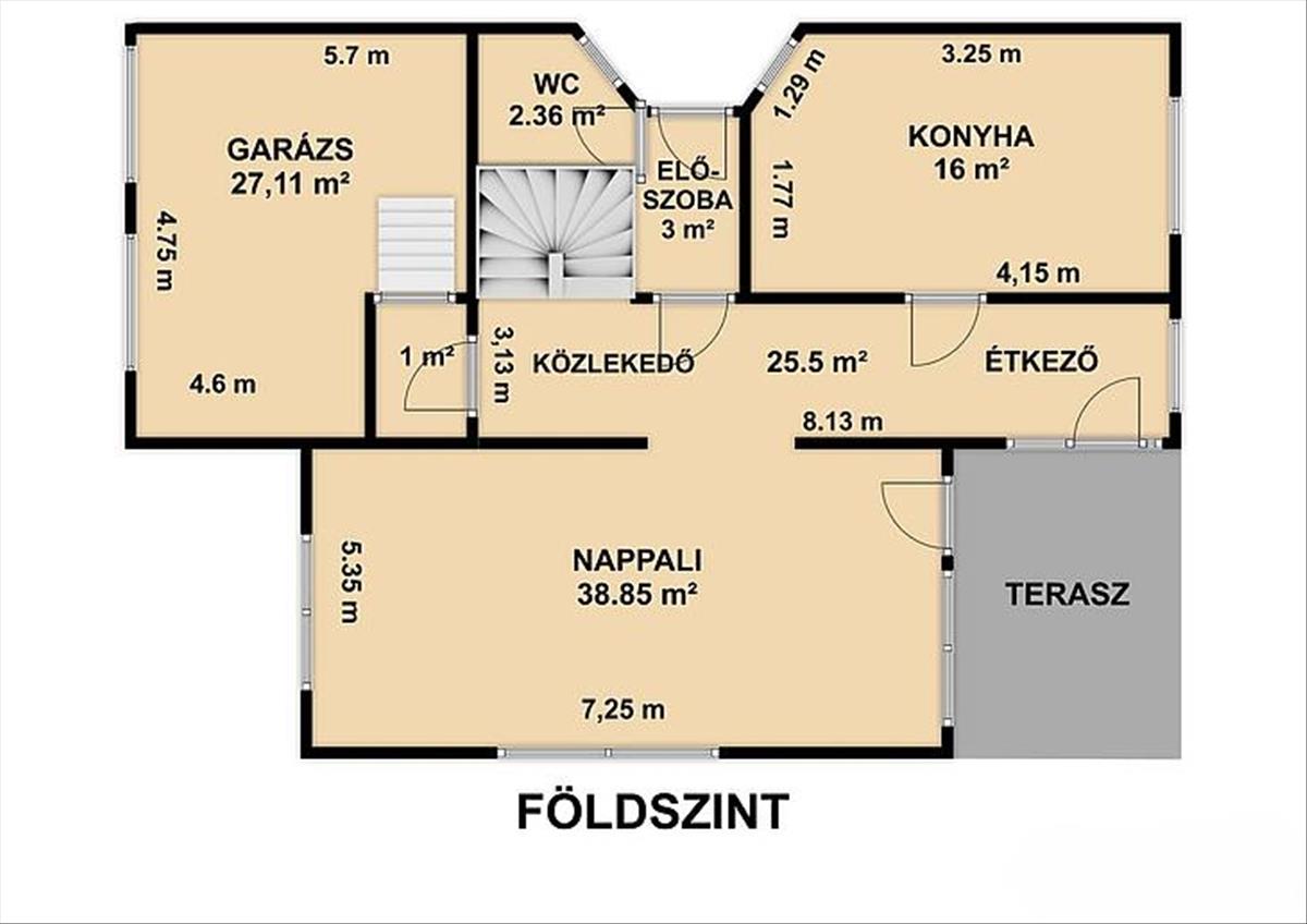 Nappali, konyha, étkező, közlekedő, wc, előszoba, 2 állásos garázs.