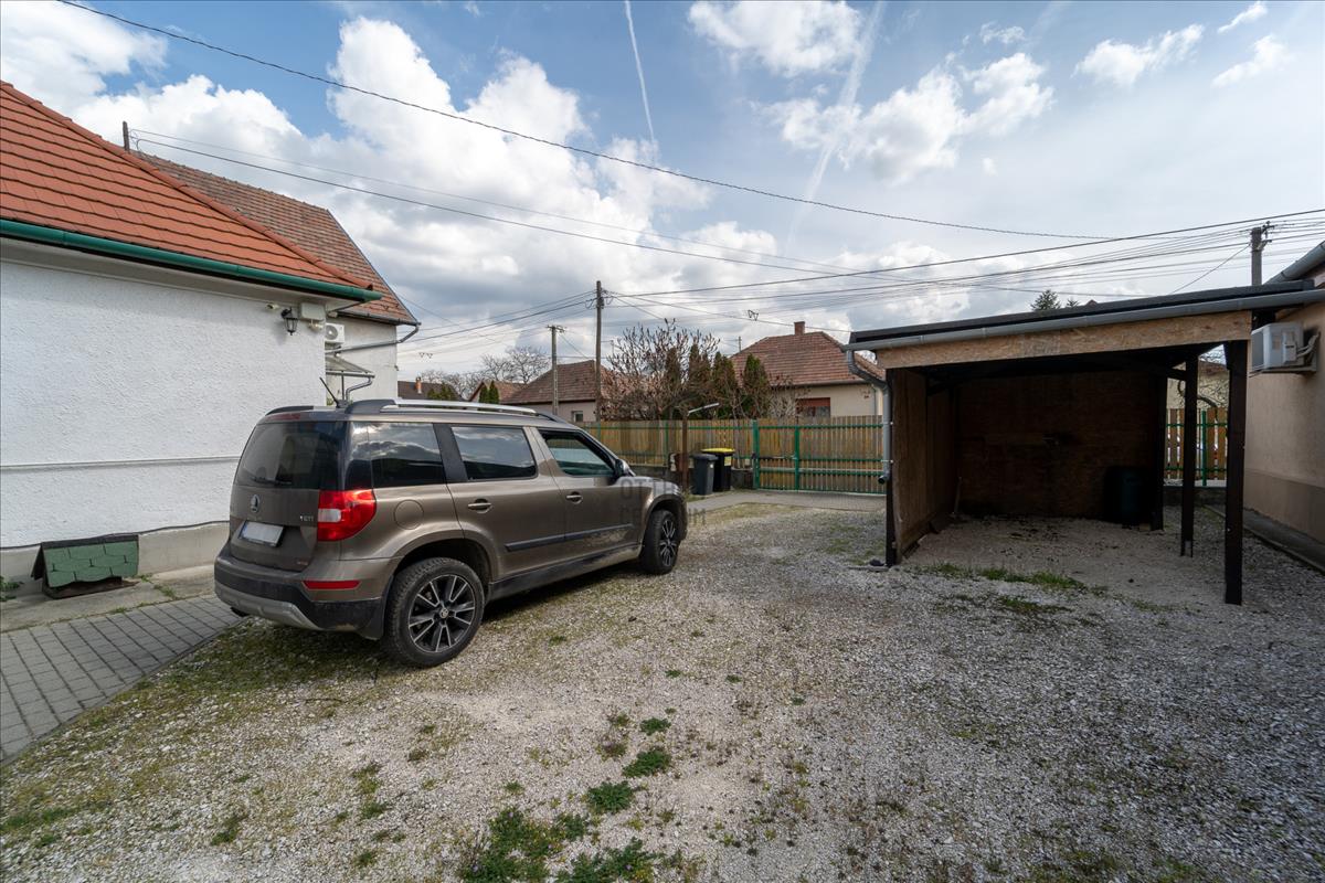 A telken elektromos kapu biztosítja a kényelmes bejutást, továbbá fedett autóbeálló és praktikus udvari tárolók is helyet kaptak, megkönnyítve a mindennapi életet.