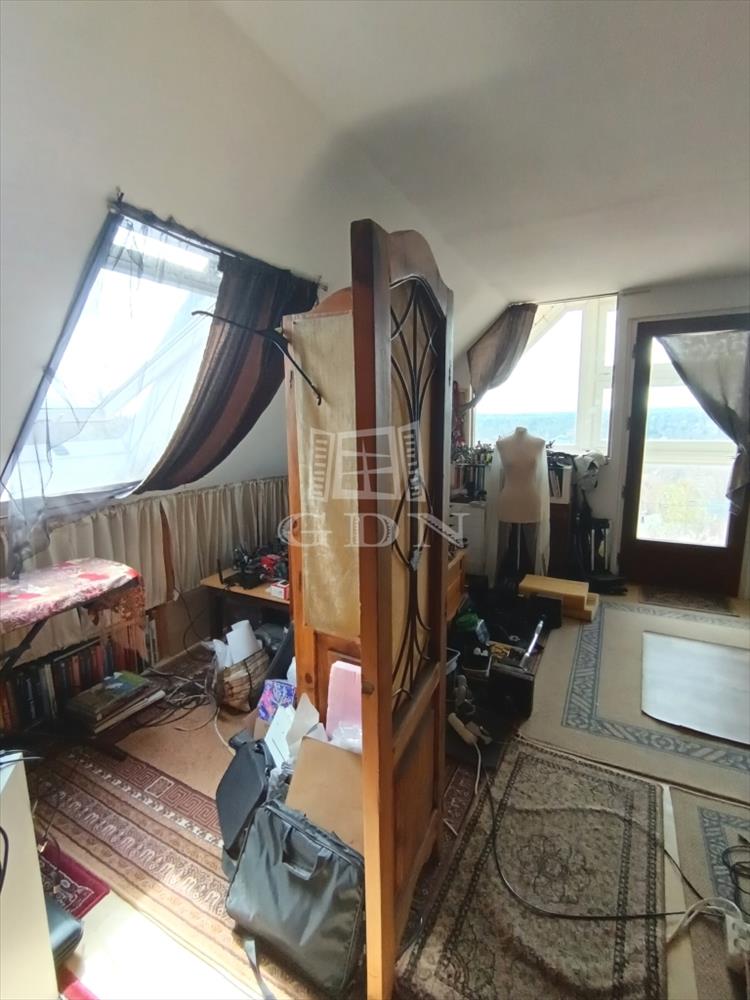 A beépített tetőtér jelenleg egy helyiséget képez, amely szinte körbe panorámás. Ezt a részt egy válaszfallal 2 szobává alakíthatjuk, ahogy az eredeti terven is szerepelt. Ezáltal 3 szobássá téve az ingatlant.