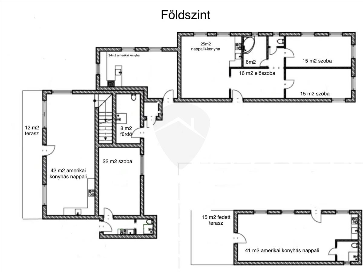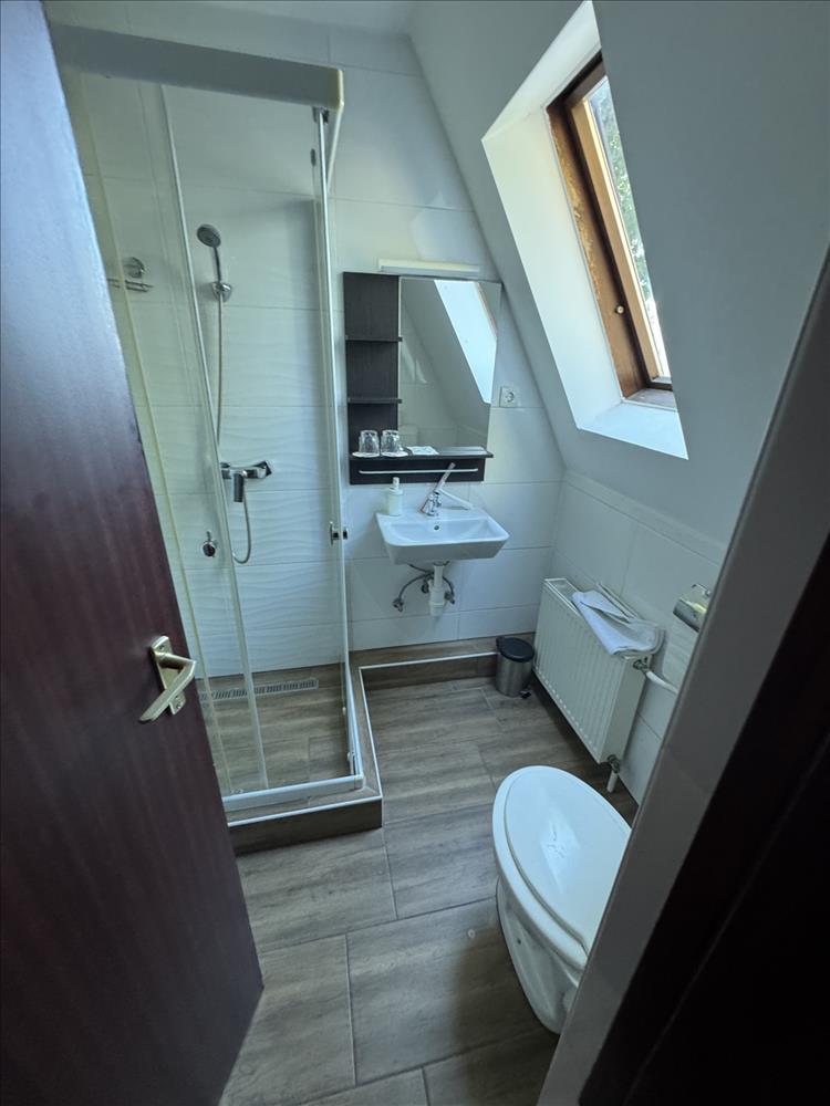 Egy 32 m²-es kisebb lakrész, ahol a fürdőszoba jelenleg külön bejárattal rendelkezik, de könnyedén egybenyitható a lakótérrel.