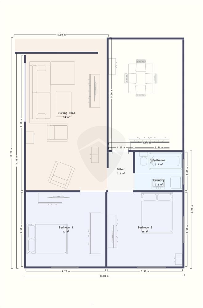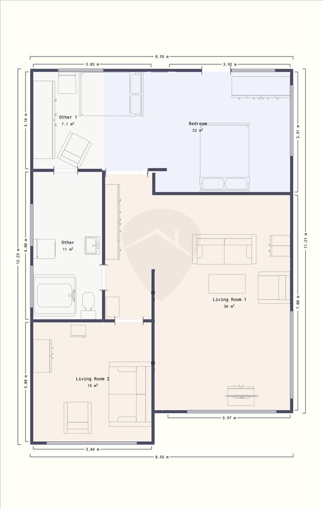 Négy hálószobával, kettő nappalival, kettő fürdővel, illetve konyhával rendelkezik.