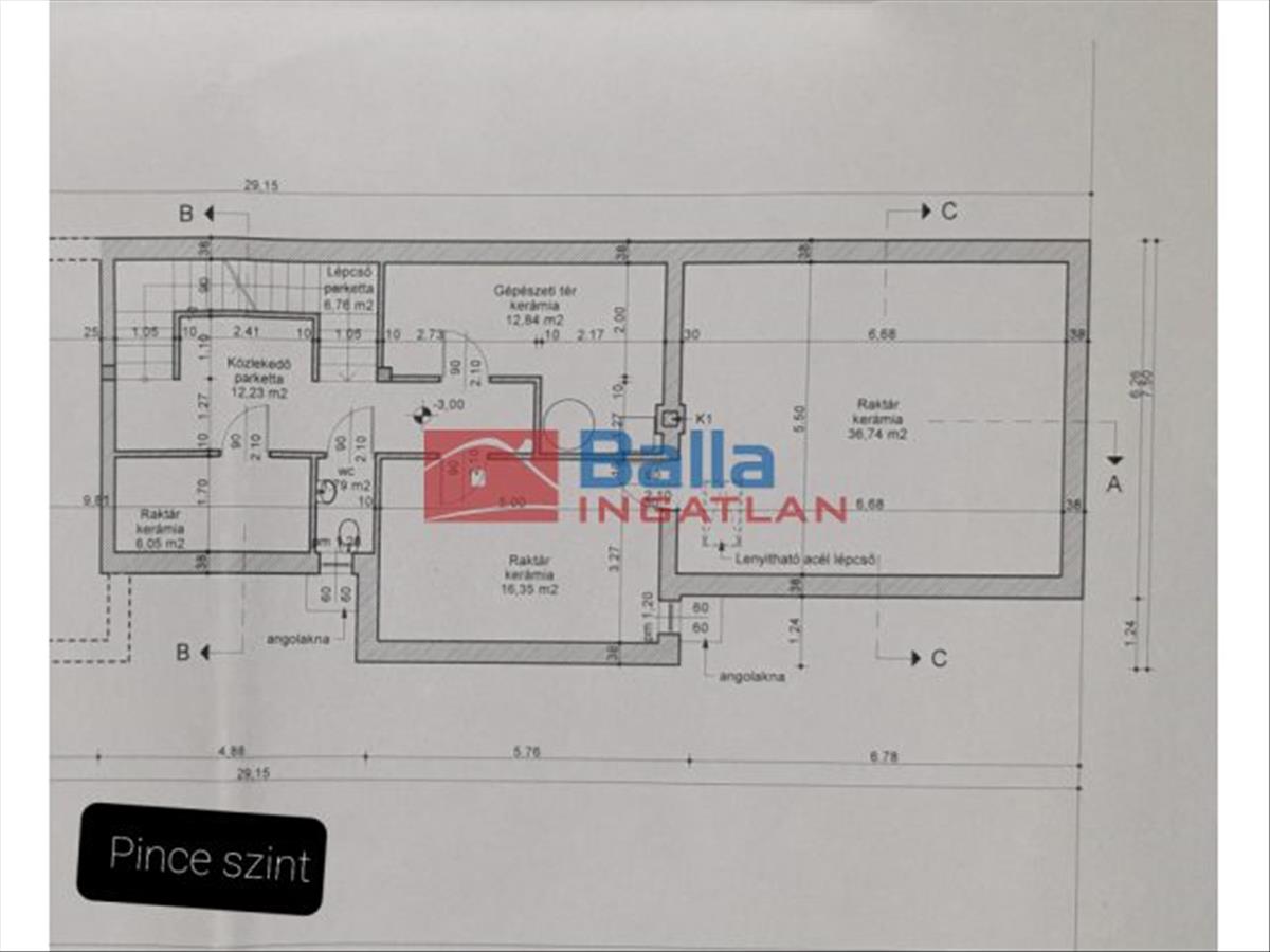 • Pince (90 m²): kerámiaburkolat, 3 m belmagasság, vízbekötés, tároló/műhely