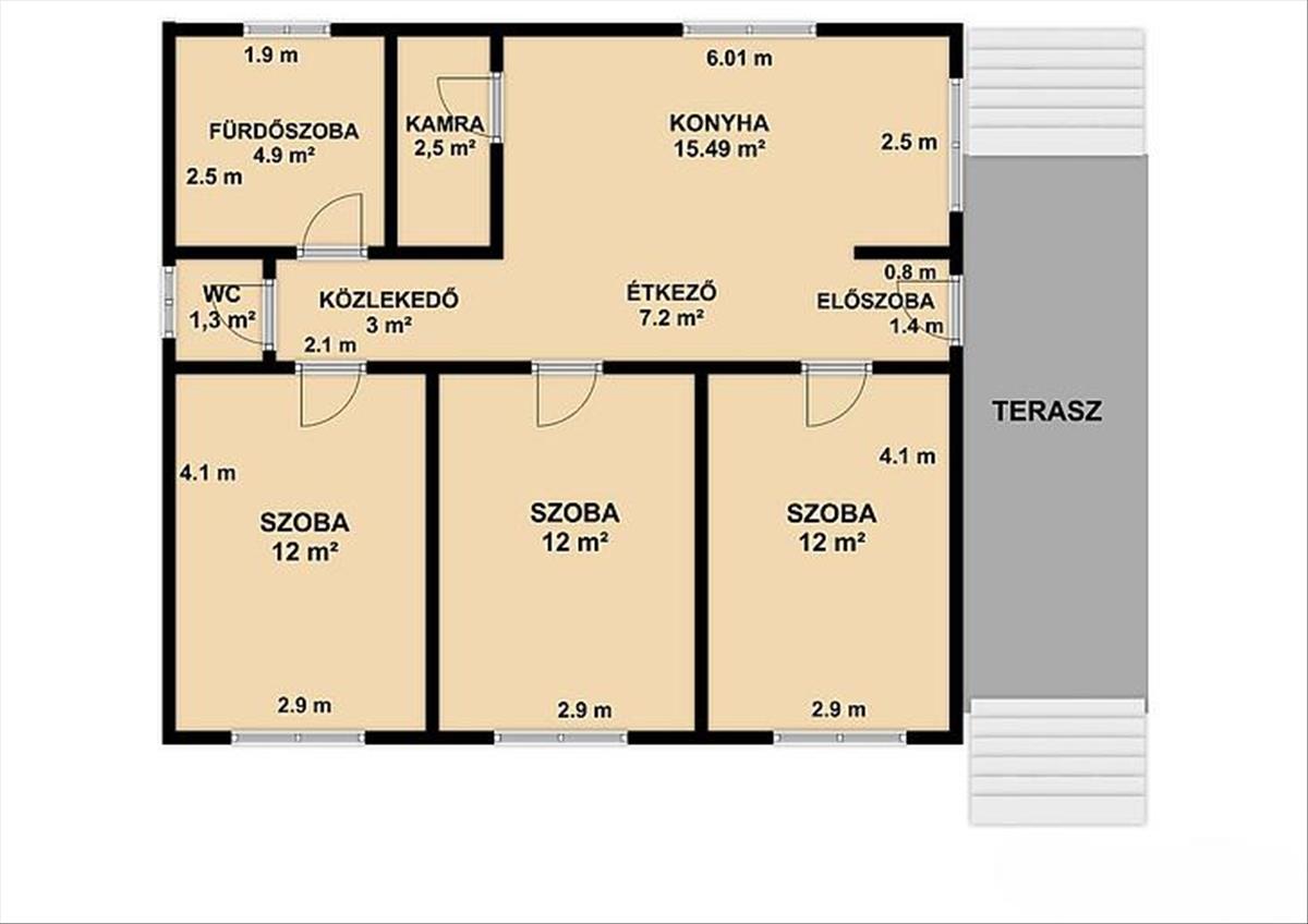 3 szoba, konyha + étkező, zuhanyzós fürdőszoba + mellékhelyiség, mellékhelyiség, kamra, közlekedő.