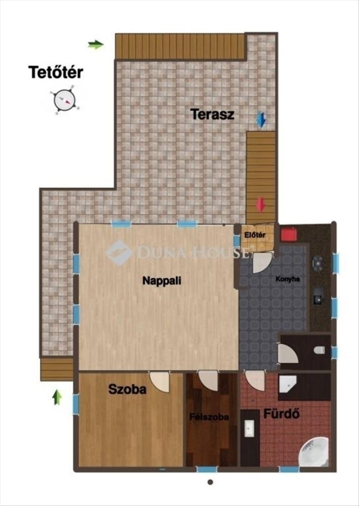 Tisztasági festést követően a tetőtér jó állapotú, helyiségei 1 amerikai konyha nappalival, 1 fürdőszoba káddal és épített zuhannyal, 1 külön Wc, 1 szoba és 1 félszoba. Az ablakok tetőtéri velux ablakok. a klímaberendezés kiépített.