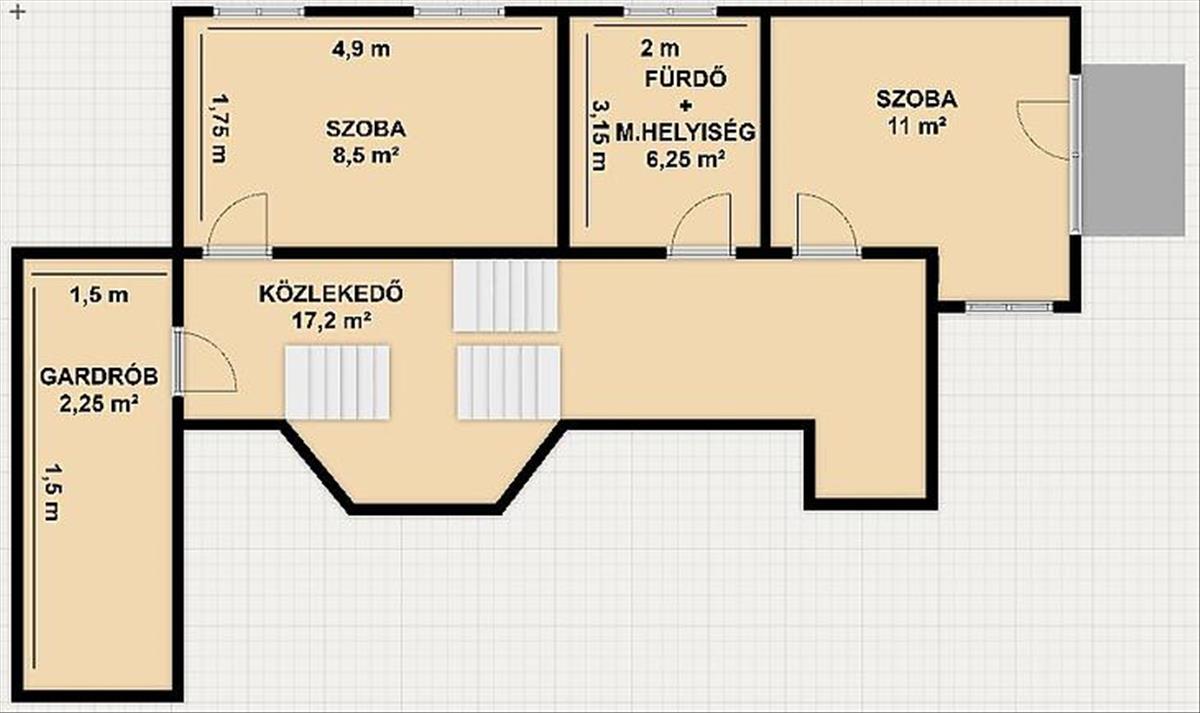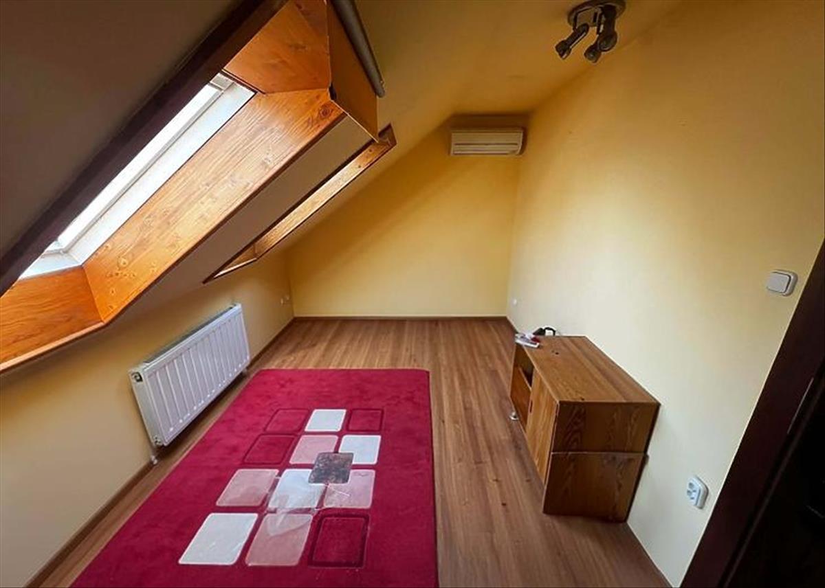 A felső szinten helyet kapott 2 szoba, fürdőszoba mellékhelyiséggel, illetve egy gardróbszoba