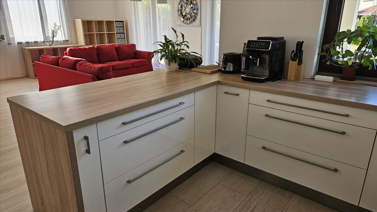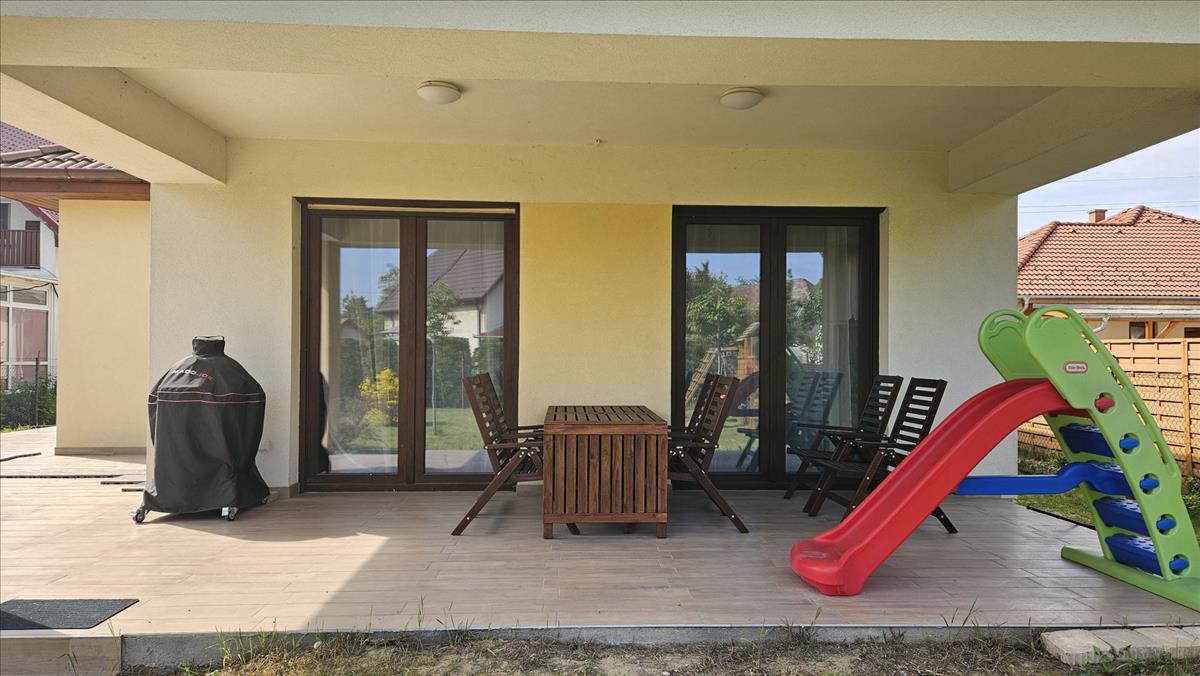 A modern, beépített konyhabútor, a kerti tároló és a játszótér a vételár részét képezi.