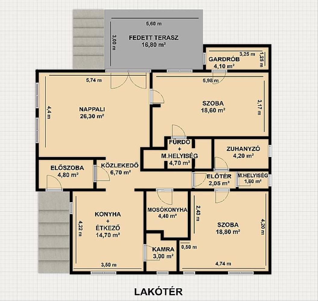 Előszoba, étkezős konyha, 2 szoba, mosókonyha, zuhanyzó+mellékhelyiség, külön zuhanyzó, külön mellékhelyiség, gardróbszoba, fedett teraszkapcsolat.