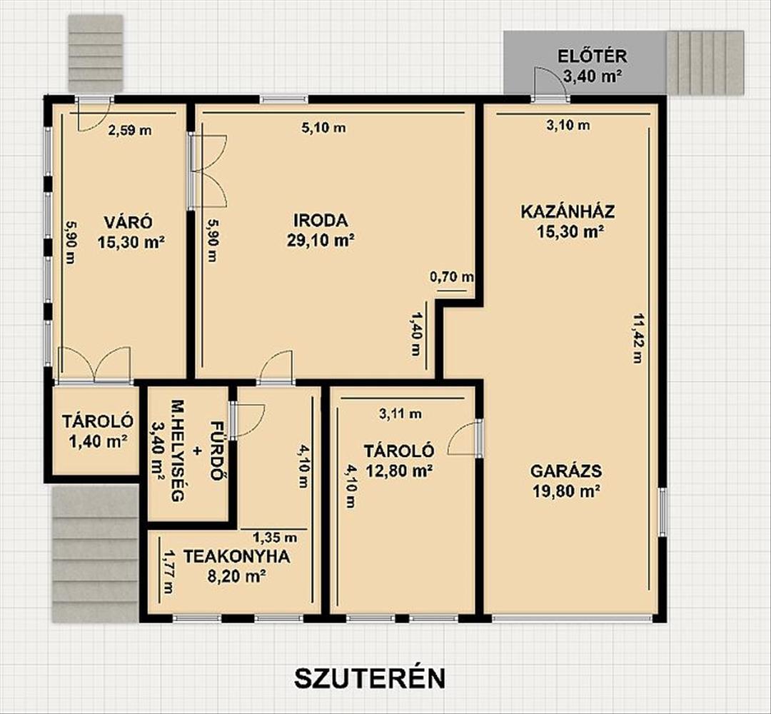 Gépészet, iroda, váró, teakonyha, zuhanyzó+ mellékhelyiség, tároló, garázs