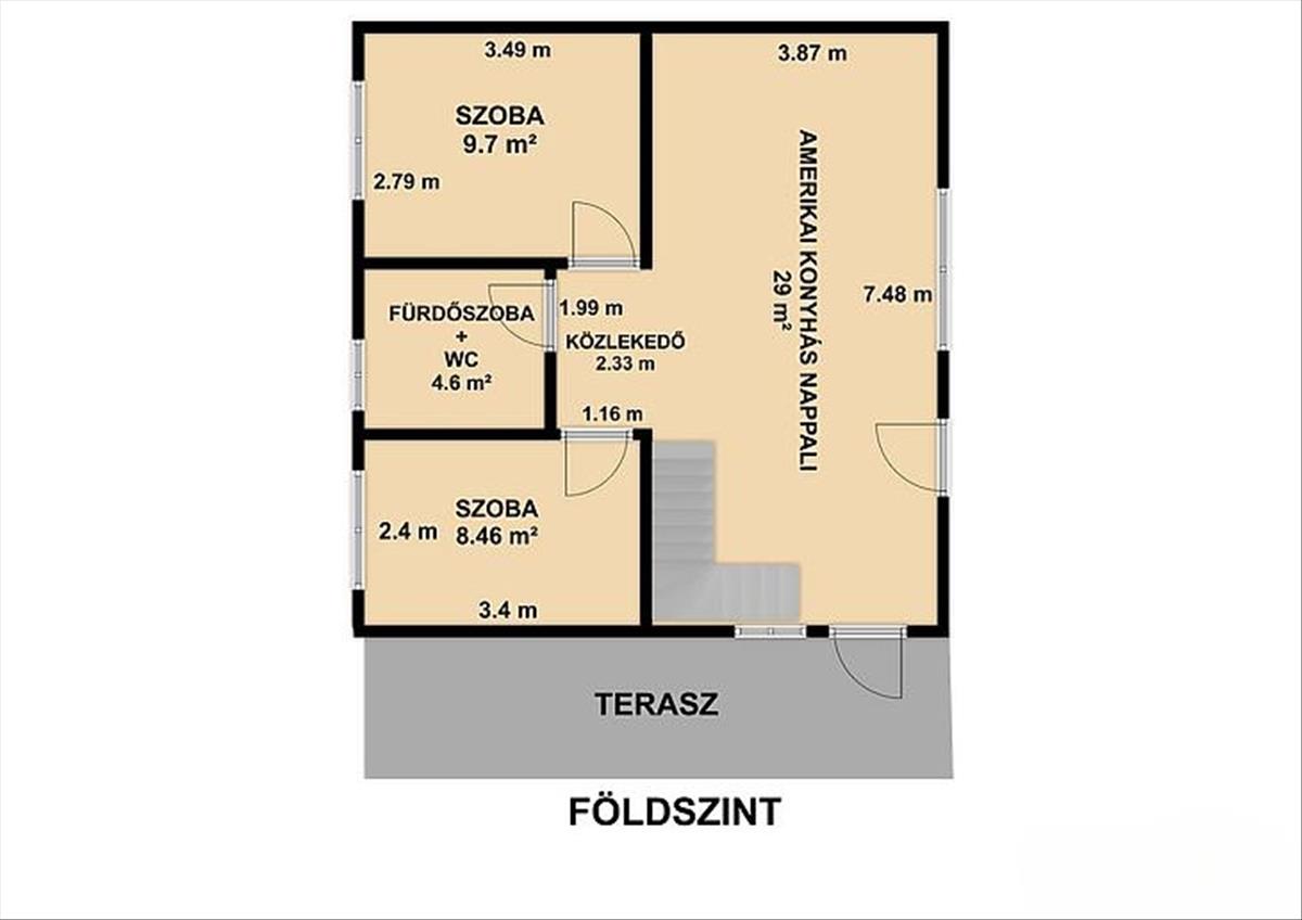 Földszint: 2 szoba, amerikai konyhás nappali, zuhanyzós fürdőszoba + mellékhelyiség, közlekedő