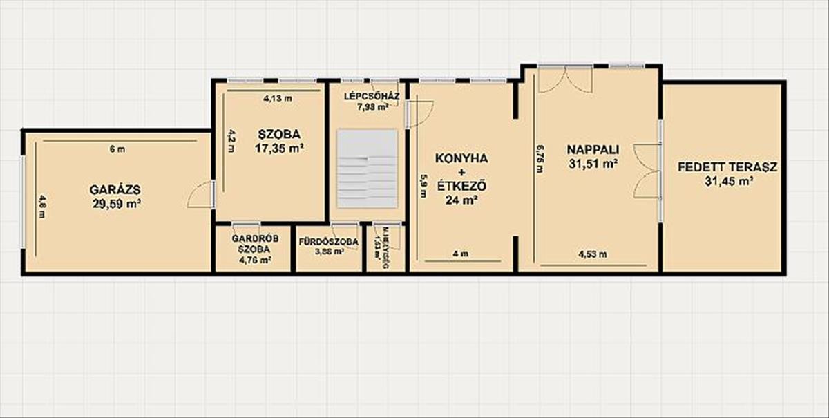Előszoba, amerikai konyhás nappali, szoba, fürdőszoba, külön mellékhelyiség, gardróbszoba, fedett teraszkapcsolat.
