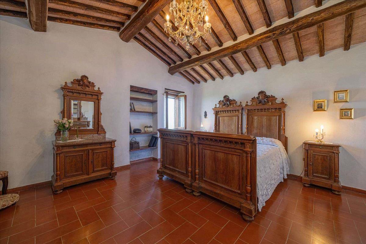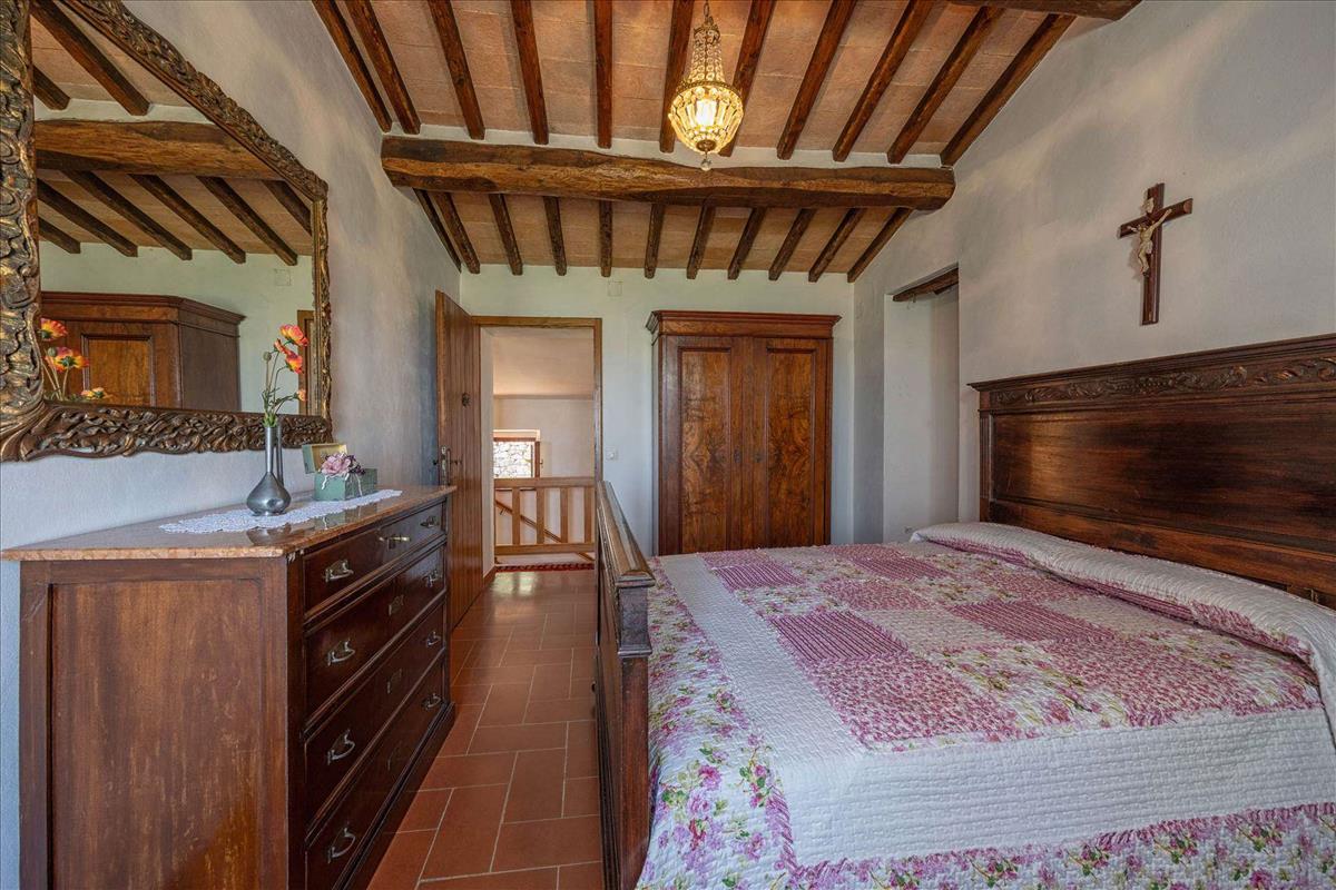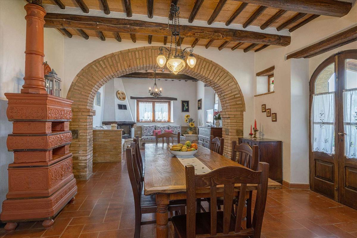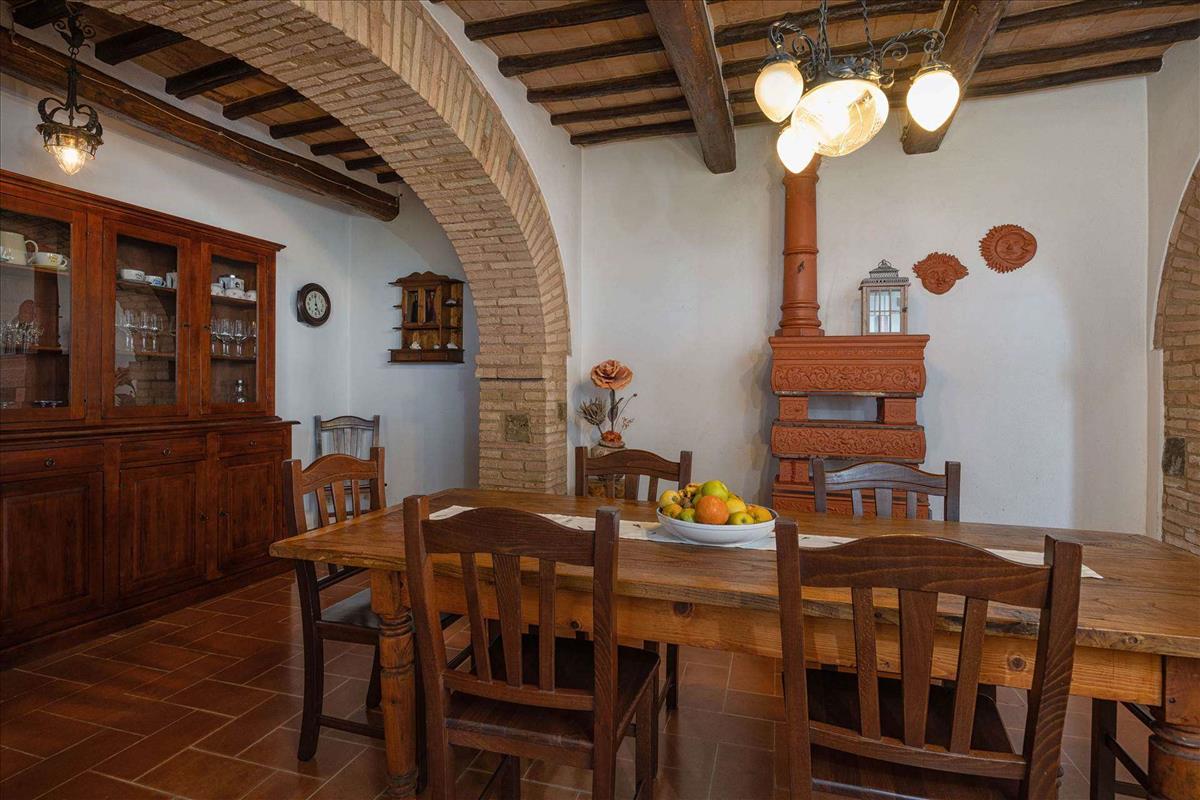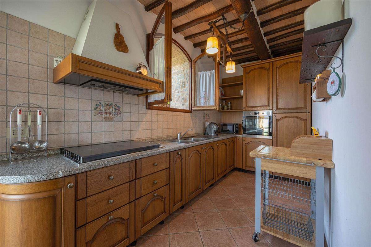 A hagyományos kőhomlokzat, az ívelt ajtók, a terrakotta padló, a boltíves mennyezet és a megvilágított fa gerendák megőrzik a vidéki Toszkána autentikus jellegét, tükrözve az otthon gazdag örökségét.