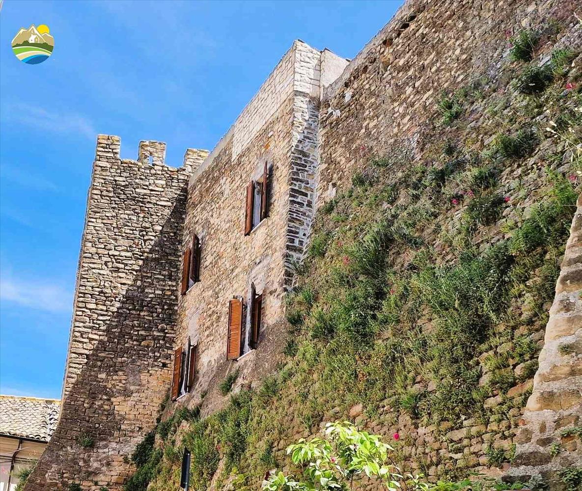 Terrakotta cseréptetők, crenellált tornyok, és lélegzetelállító kilátás a Gran Sasso d'Italia felé.