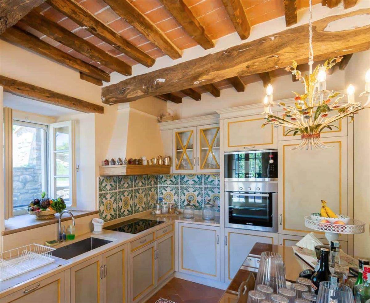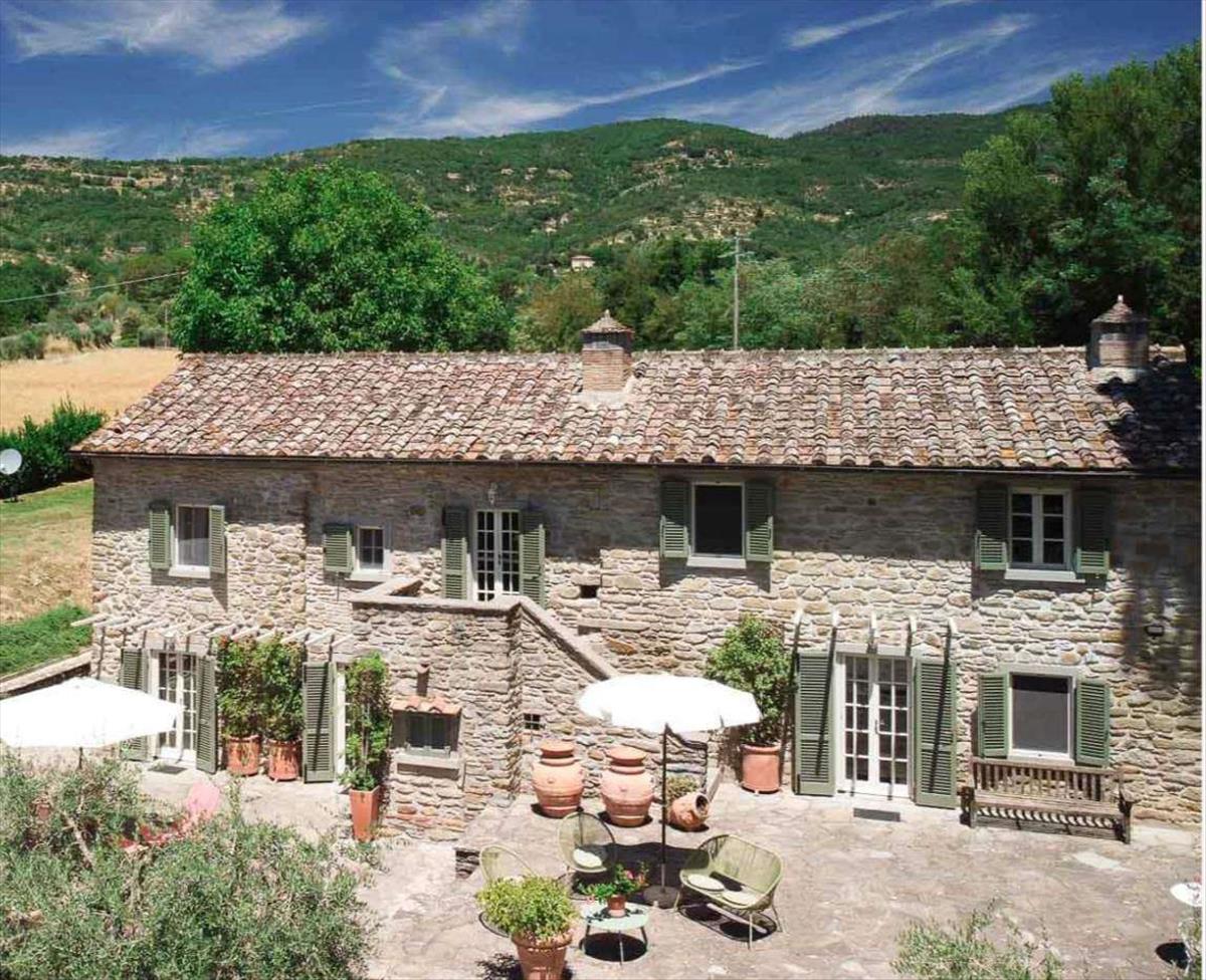 A ház tipikus Toszkán stílusú kőhomlokzattal és külső lépcsővel, már felújítva, aprólékos figyelmet fordítva a részletekre.