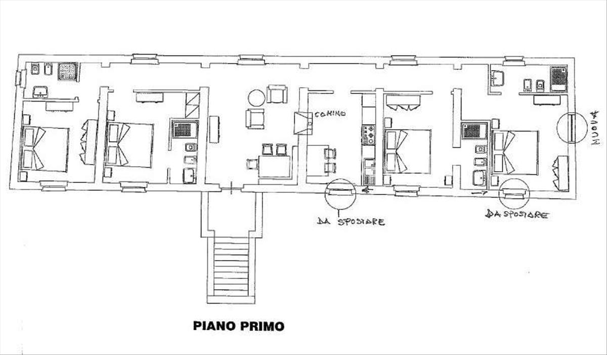 Cr158 - Eladó téglás parasztház Castiglione del Lago közelében, csodálatos kilátással a Trasimeno-tóra. Leírás: A körülbelül 280 m²-es parasztház részben felújításra került: az alapozások, a padlók és a tetők felújítása, a részletek javítása, a rögzítések megerősítése, a vakolat és az elvégzendő padló megszilárdítása.Összetétel: A földszinten hat szoba található. Egy külső lépcsőházból felmegyünk az első emeletre, amely nappali, étkező, konyha, négy kétágyas hálószoba és két fürdőszoba.