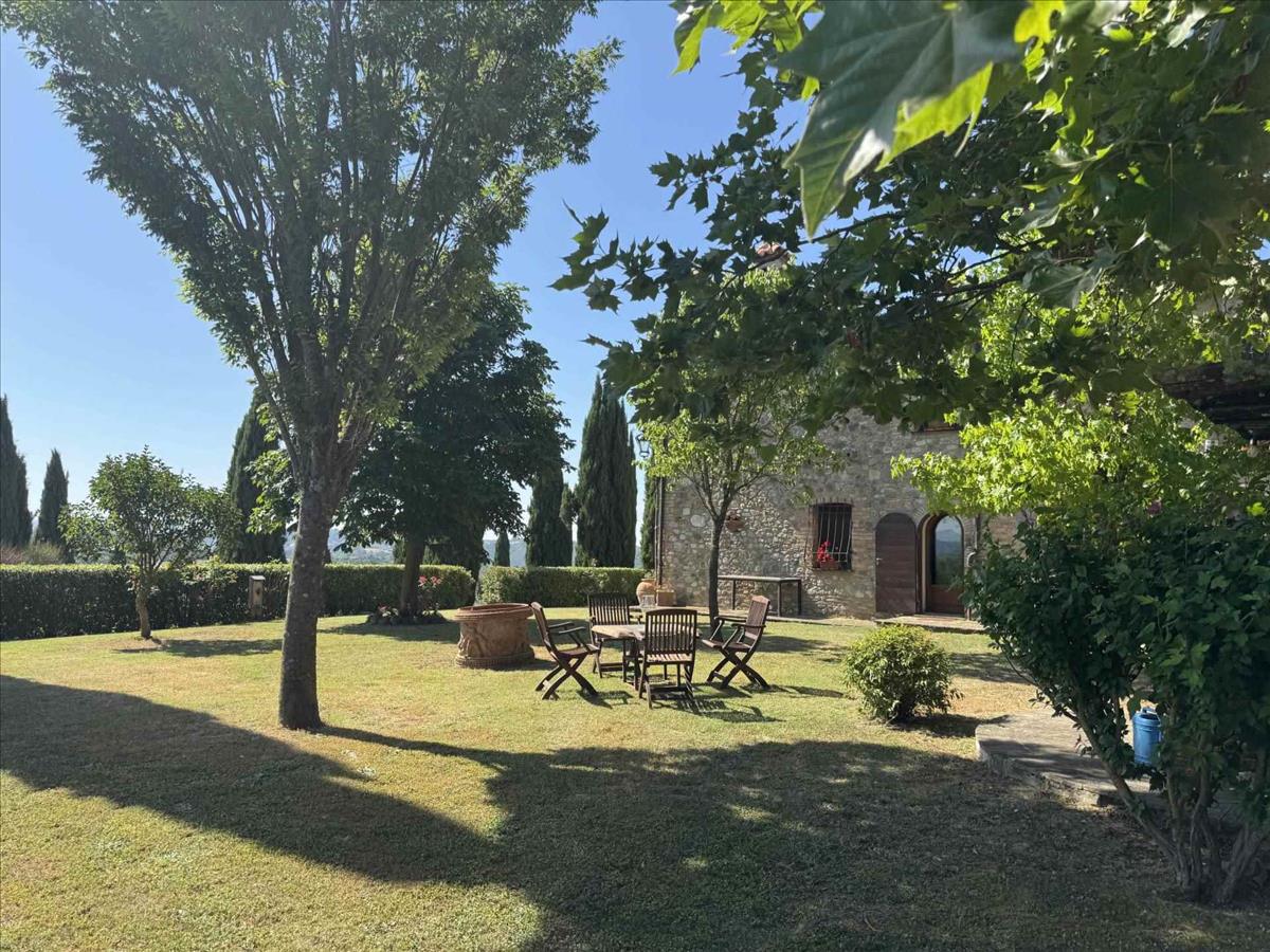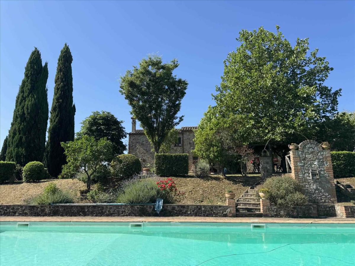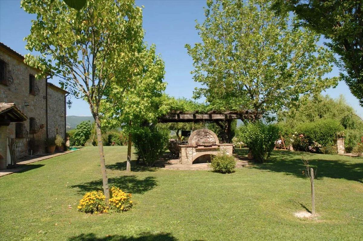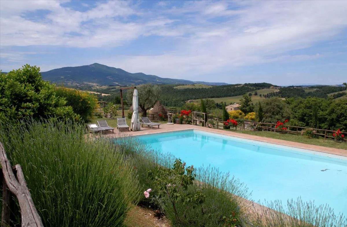 Az Umbria és Toszkána határán, dombos helyzetben található ez a csodálatos kőfarm, amely lélegzetelállító panorámát nyújt, és a vidéket békés zöld környezet veszi körül.