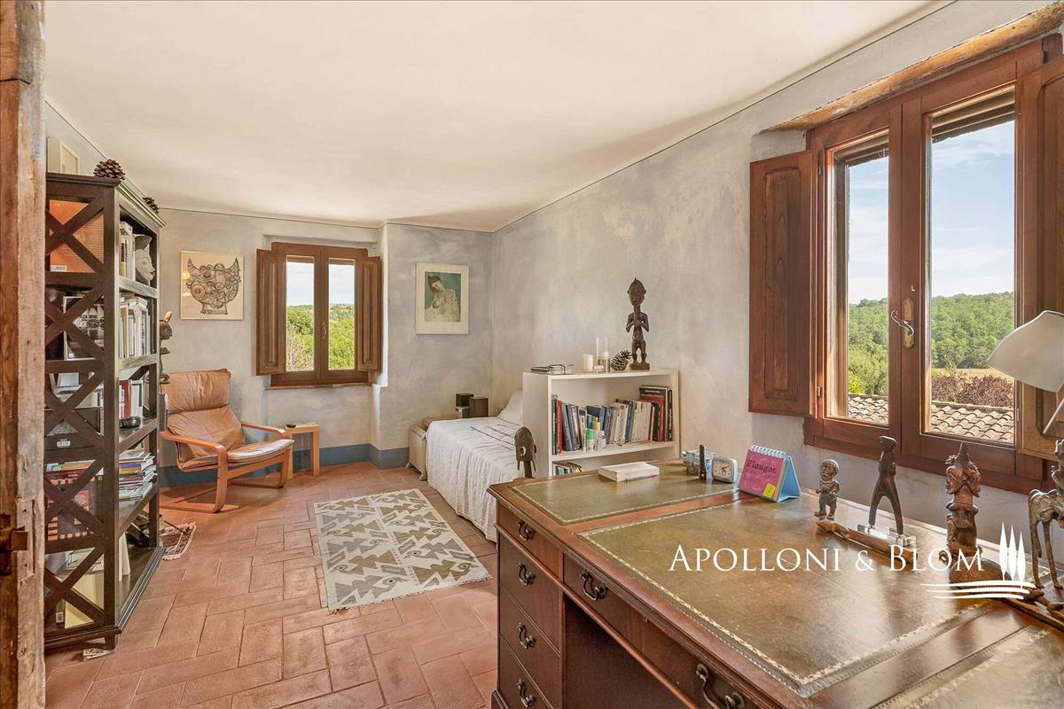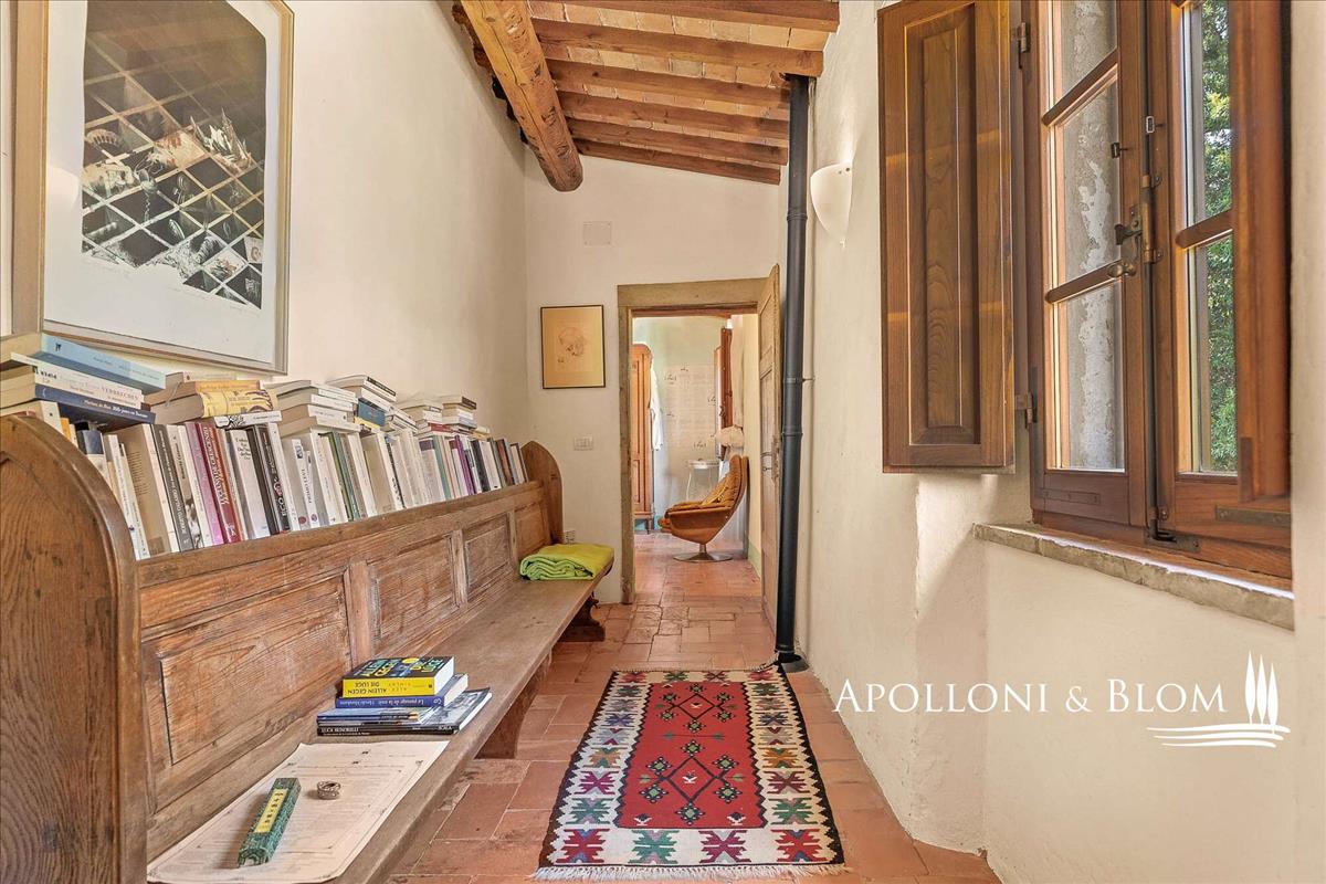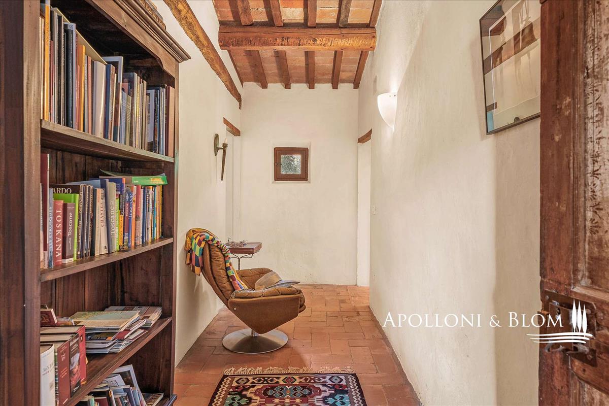 Érett fák által védett és a napsütötte déli horizont felé nyitott ingatlan különleges magánéletet és nyugalmat nyújt, megszakítás nélküli kilátással a Toszkán tájra.