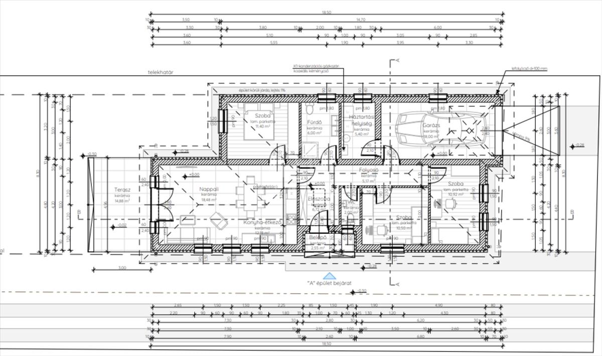 Helyiségei:nappali 18, 48 m2 teraszkapcsolattal, előszoba 6, 72 m2, folyosó 5, 17 m2, háztartási helyiség 5, 40 m2, szoba 10, 50 m2, szoba 10, 92 m2, wc 2, 0 m2, fürdő 6, 0 m2, szoba 11, 40 m2, konyha-étkező 12, 18 m2, garázs 18 m2, belépő 2, 55 m2, terasz 14, 88 m2.
