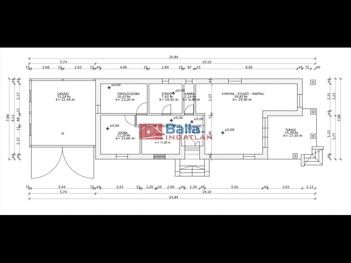 A 760 m2 szép, parkosított területen játszótér, fedett kerti bográcsozó, sok gyümölcsfa hívogat befelé az utcáról. Az igényes terméskövel burkolt, Ytong téglából 2005-ben épült földszintes ingatlan elosztása :